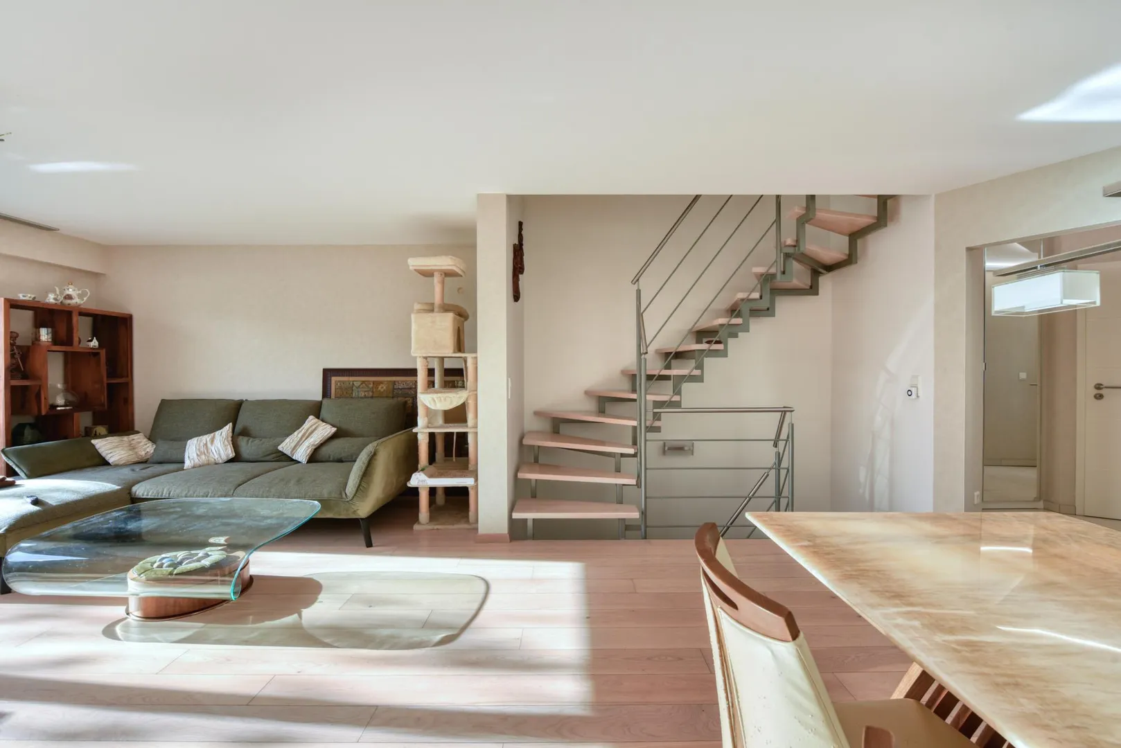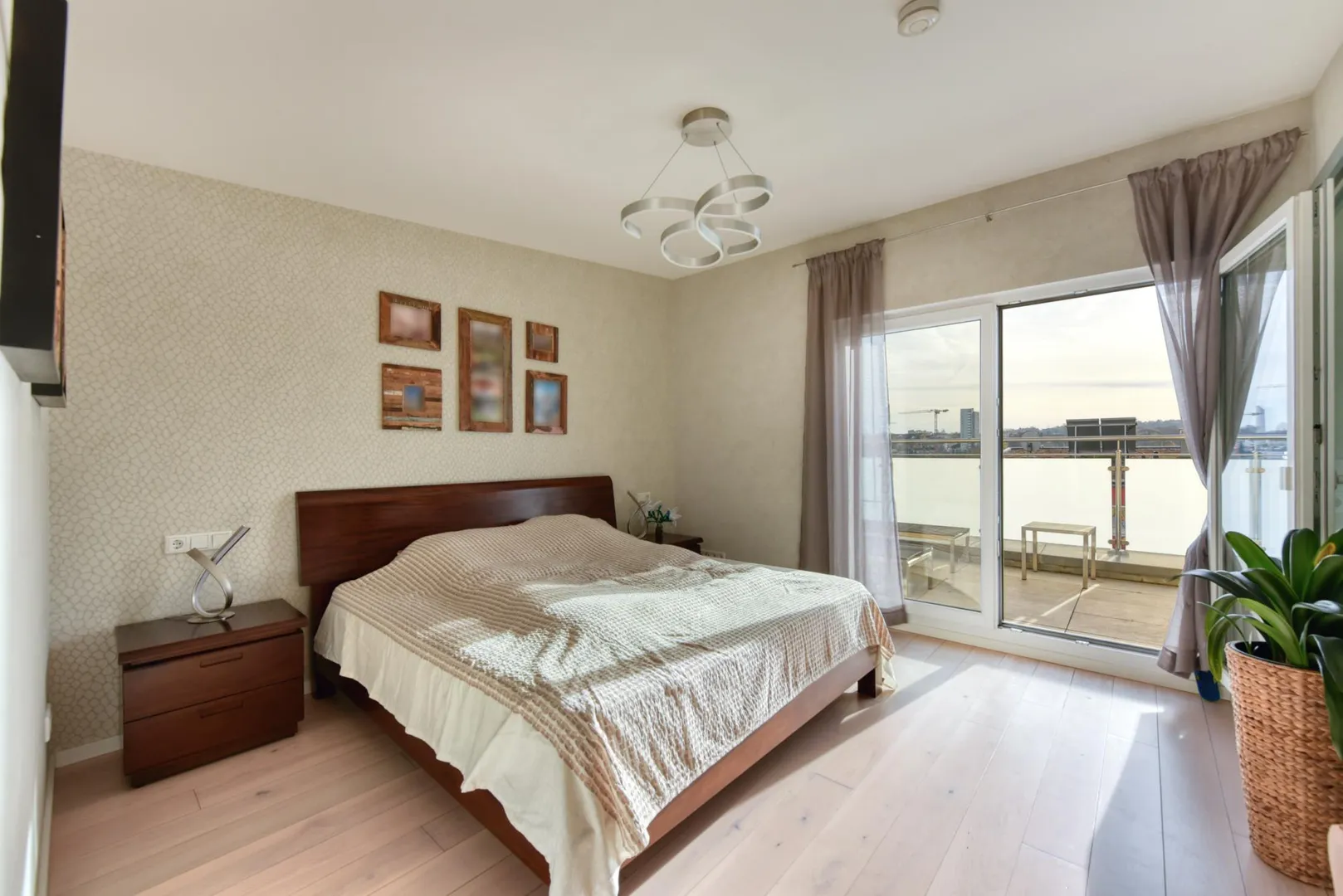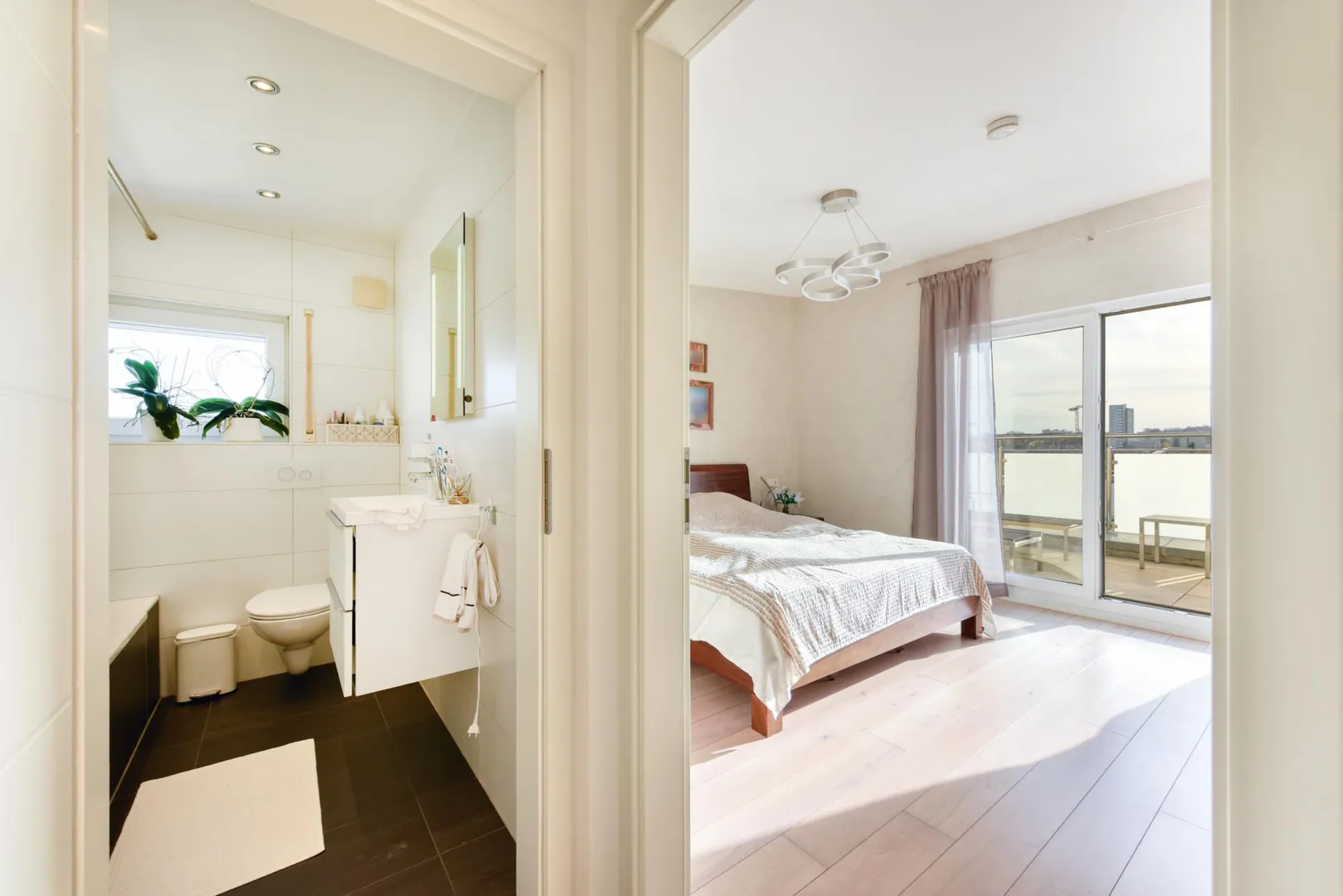 Im Dachgeschoss, mit ca. 38 m² Wohnfläche, befinden sich ein Arbeitszimmer mit Regalen, ein Schlafzimmer mit einem Ankleidebereich und Terrassen-Zugang, ein Badezimmer mit Fenster sowie eine uneinsehbare Süd-Dach-Terrasse.