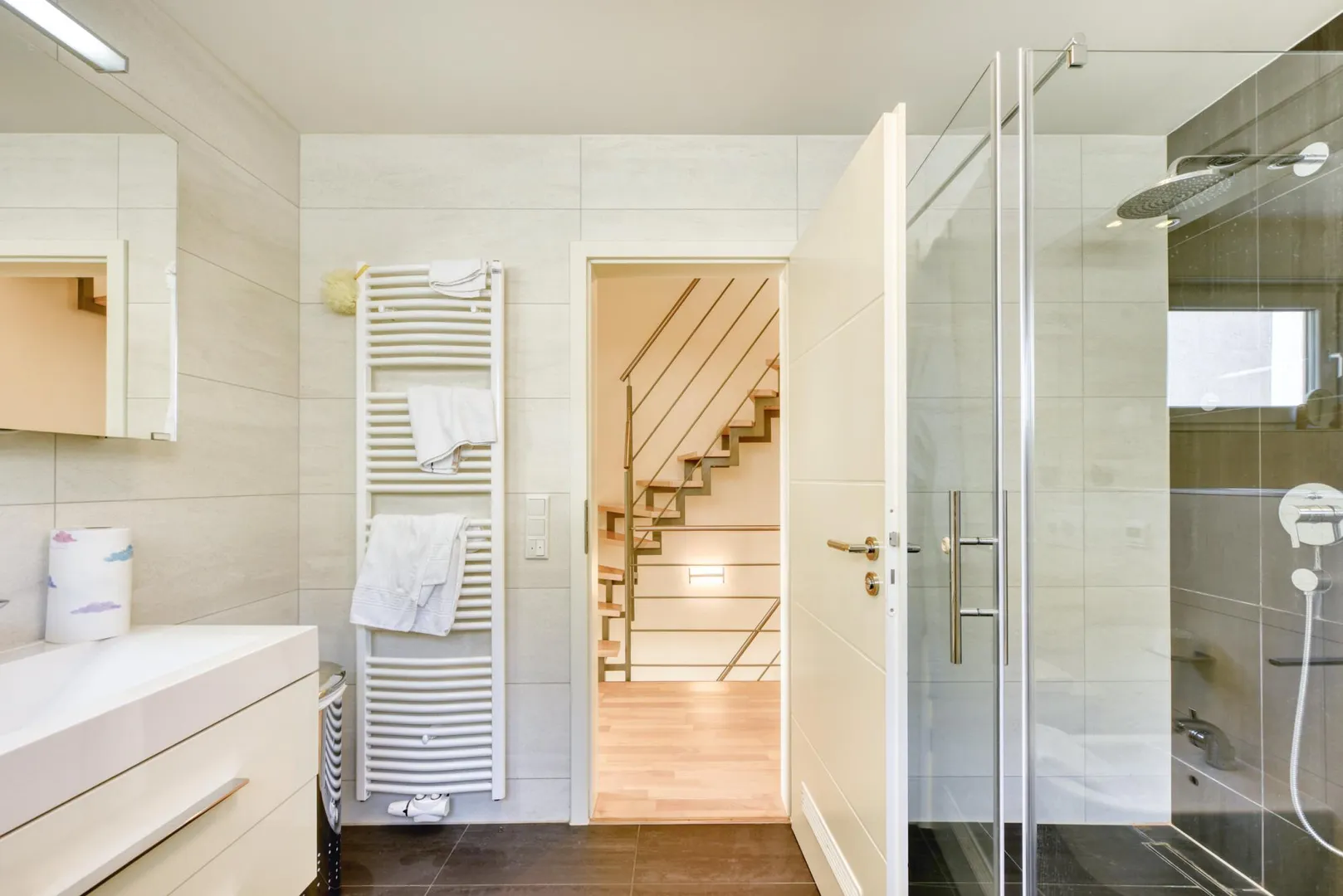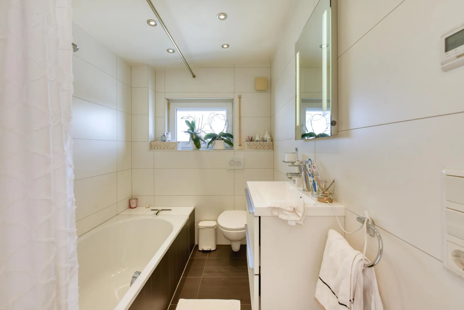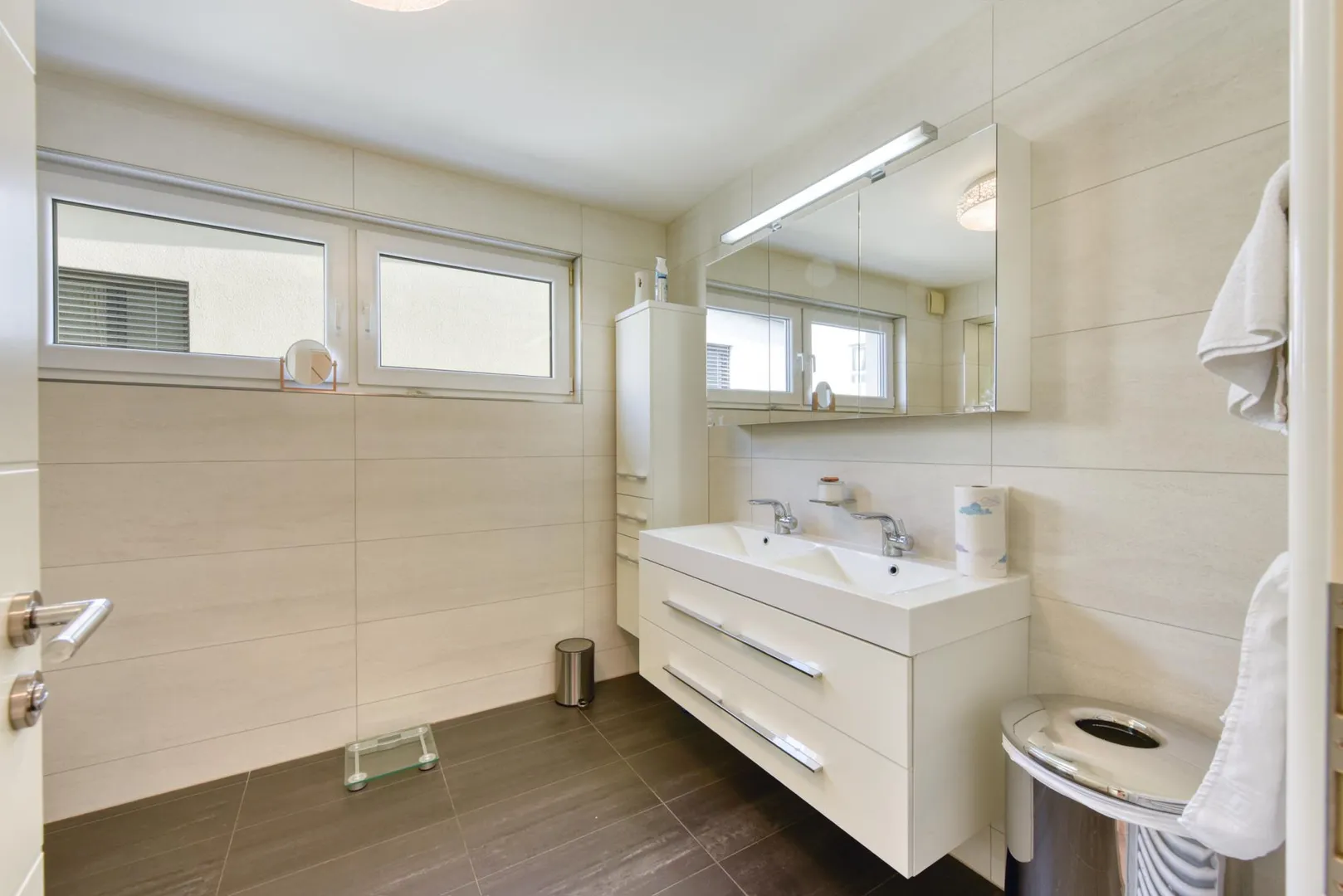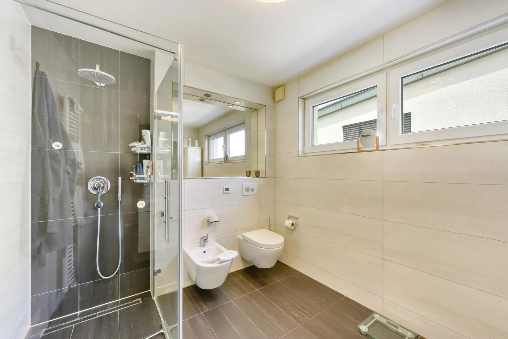 Das raumhoch geflieste Tageslicht-Bad ist ausgestattet mit einem Fliesenboden, einer bodentiefen Dusche, einem WC, einem Bidet, einem Handtuchheizkörper sowie Badmöbeln. In den Zimmern sowie im Flur ist Parkett verlegt.