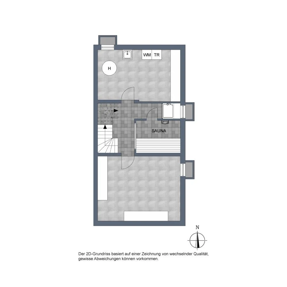 Im Untergeschoss, mit ca. 48 m² Nutzfläche, befinden sich ein Abstellraum, ein Wasch-/Technikraum sowie eine Sauna und eine Dusche. Die Raumhöhen betragen ca. 2,35 Meter.