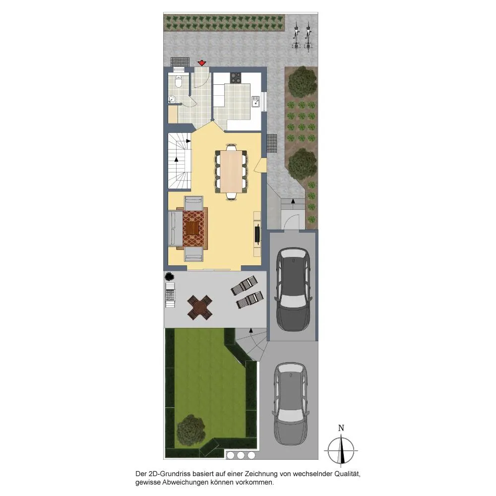Im Erdgeschoss, mit ca. 54 m² Wohnfläche, befinden sich der Eingangsbereich mit Garderobenschrank und separatem WC mit Fenster, der offene Wohn-/Essbereich, eine teiloffene Küche (keine Tür) mit Einbauküche und Außenabzug, die Süd-Terrasse und der Süd-Garten sowie die Garage mit einem Stellplatz davor.