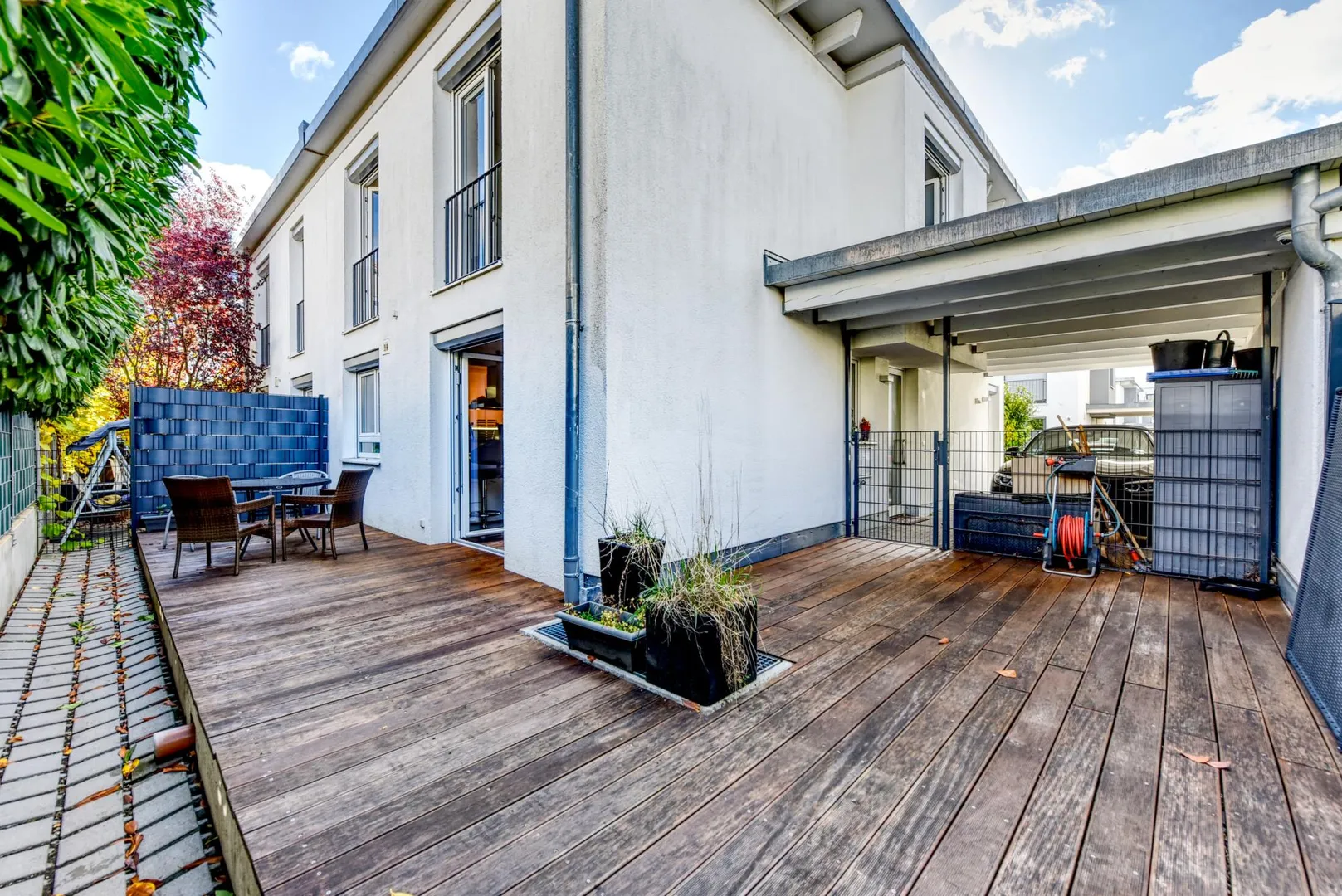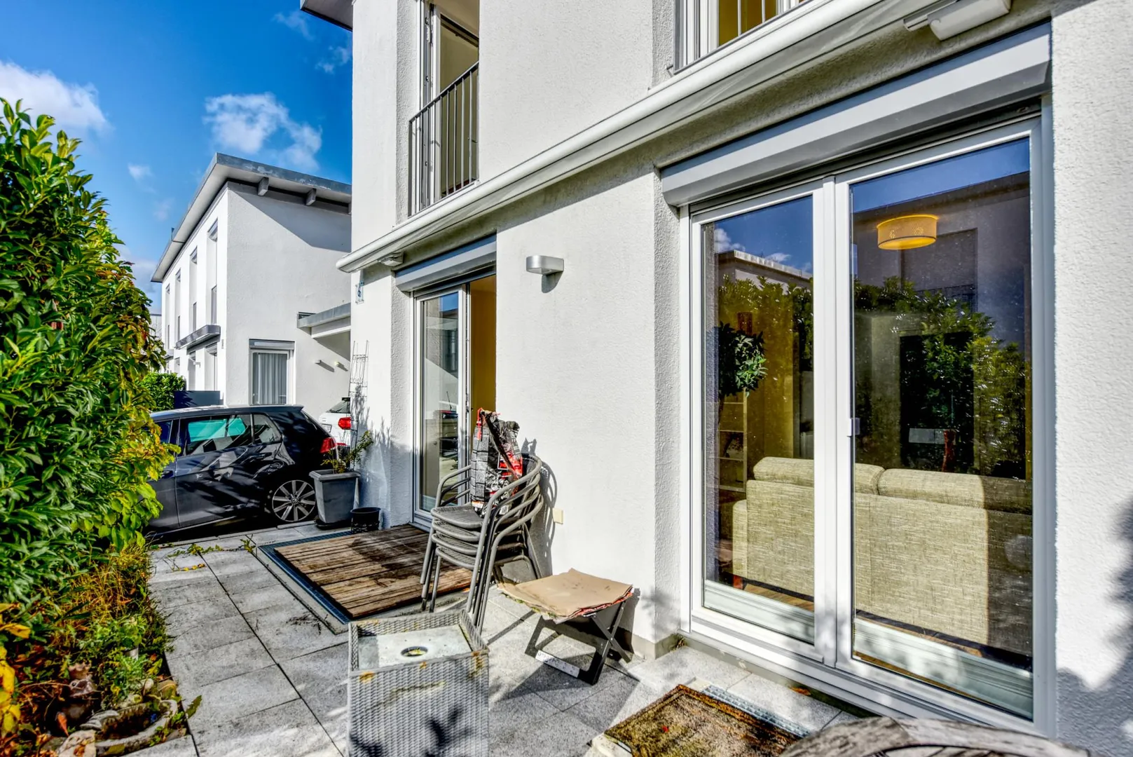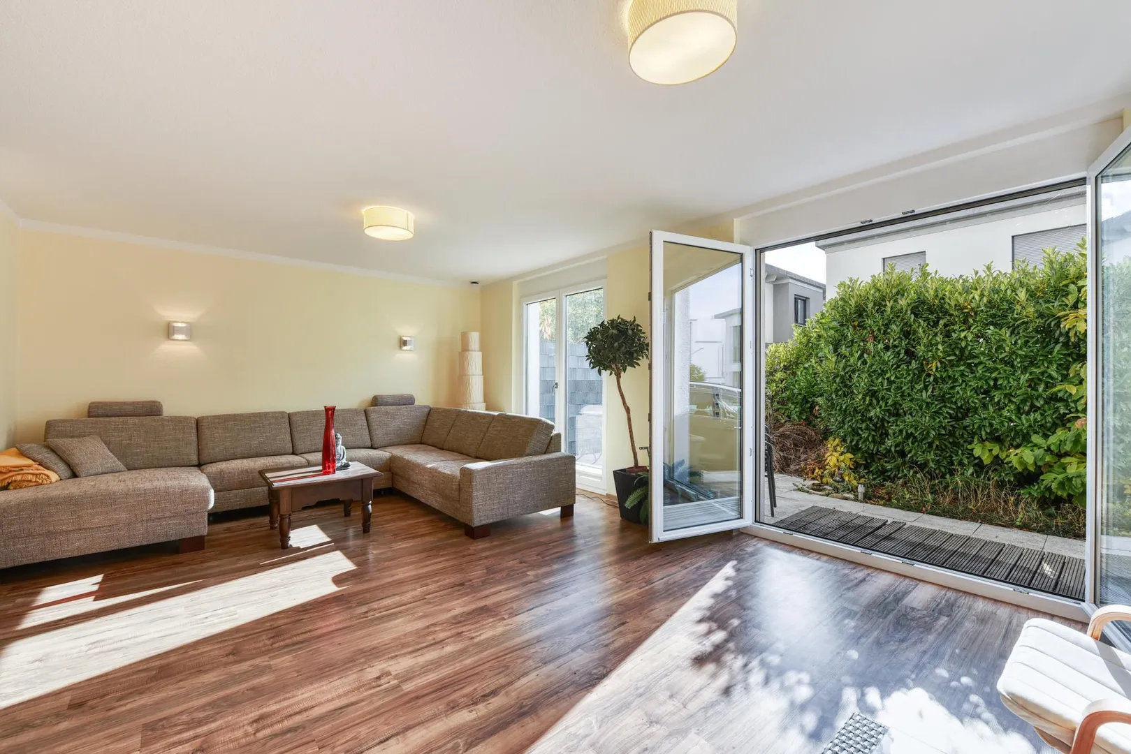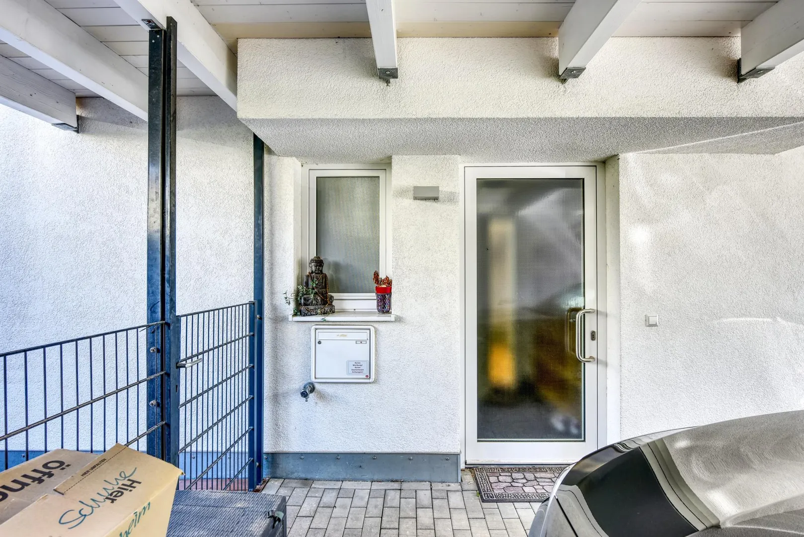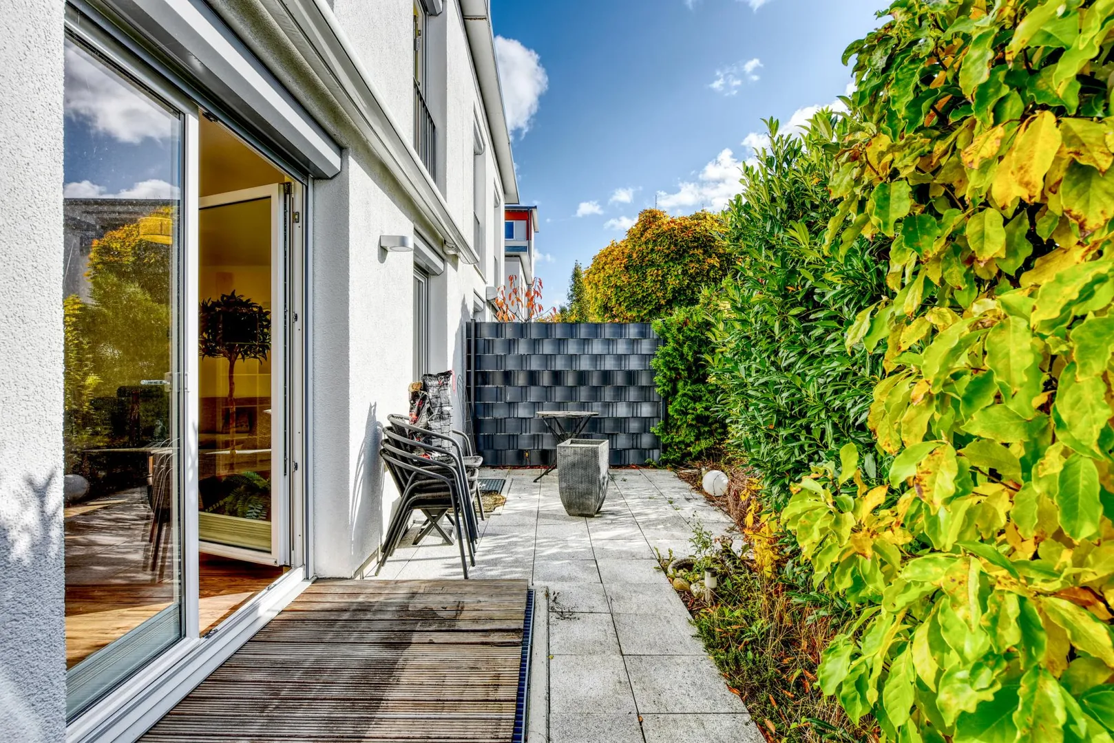 Im südlichen Bereich befinden sich eine ca. 15 m² große Terrasse, geschützt durch eine Sträucherfront und eine elektrische Markise sowie die Hauszufahrt.