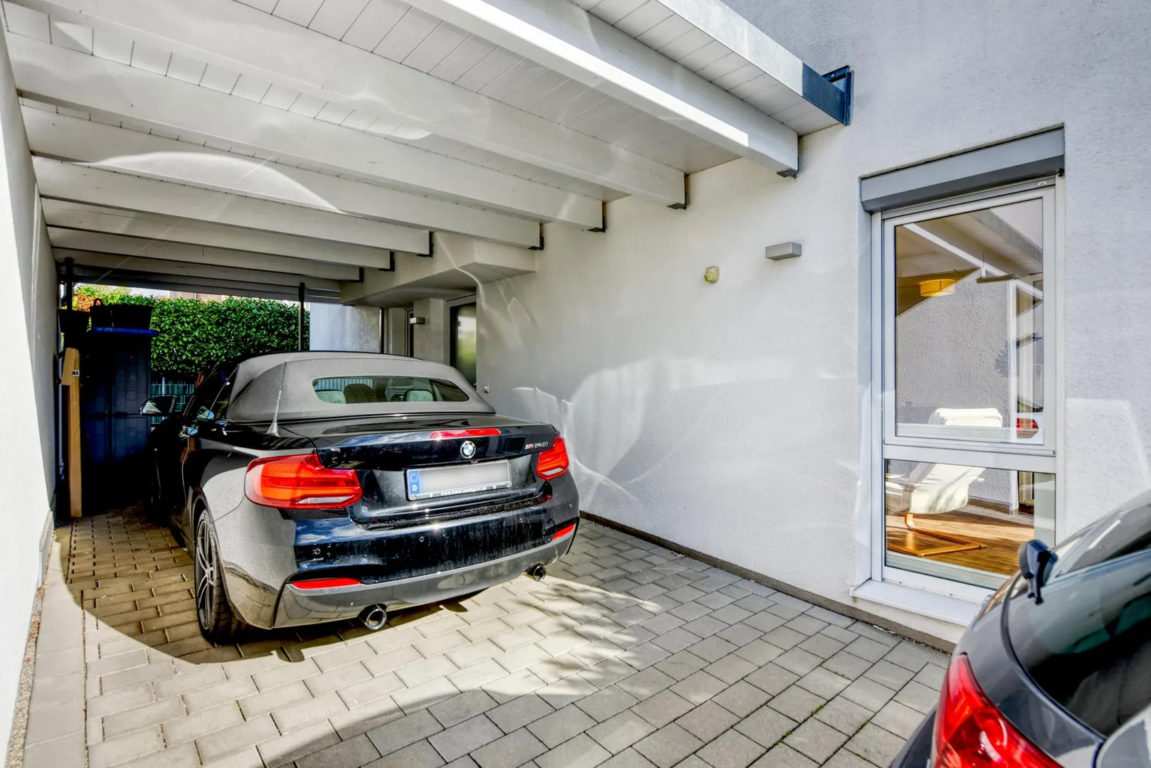 Im westlichen Bereich befinden sich der Carport mit einem zweiten Kfz-Stellplatz davor, dem Hauseingang sowie einer ca. 9 m² großen Terrasse,