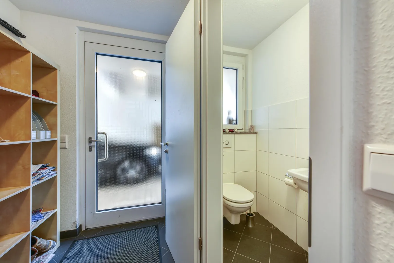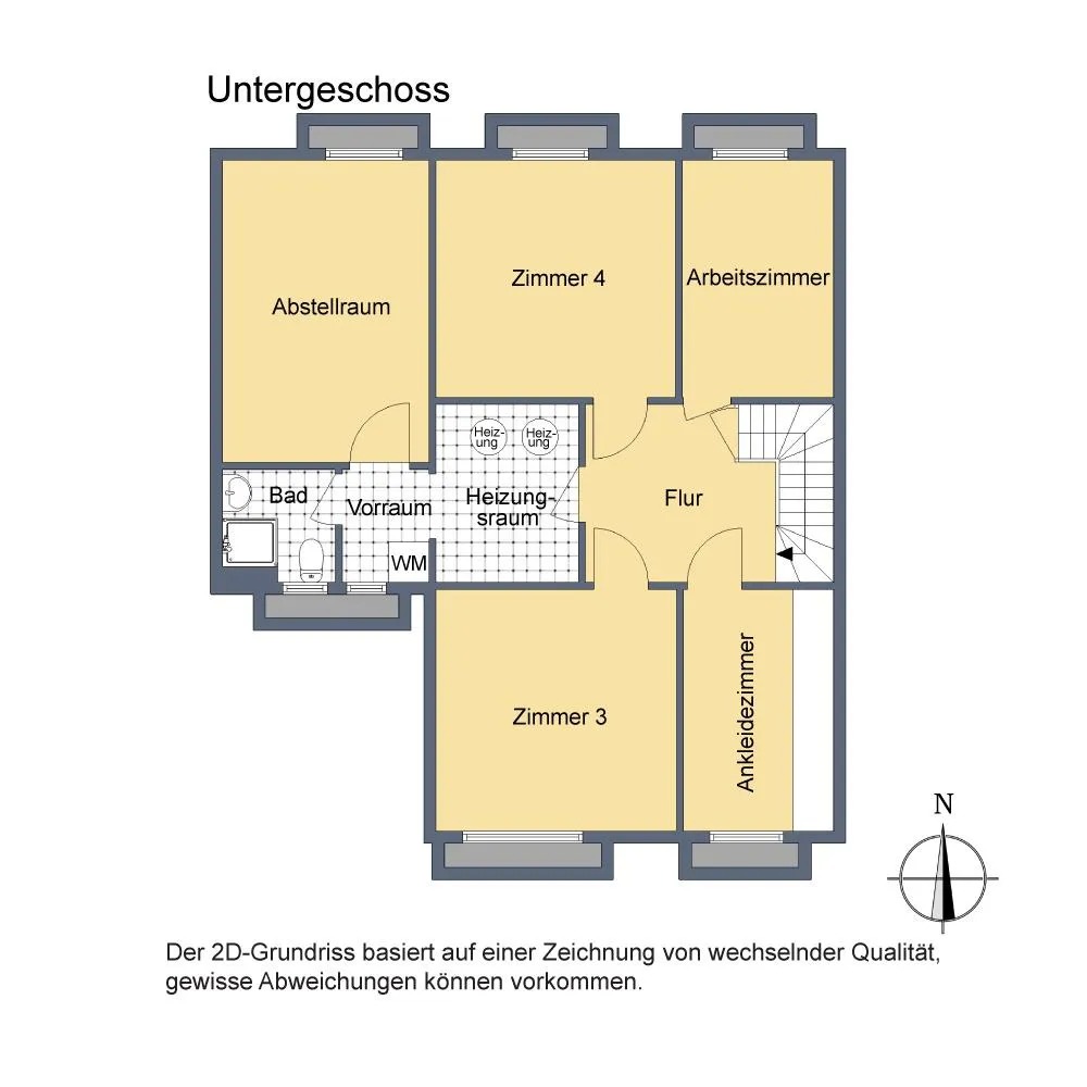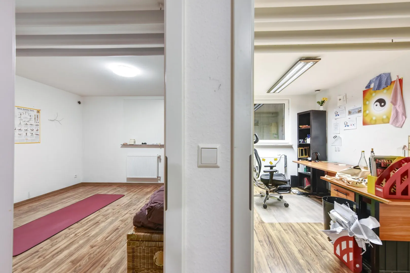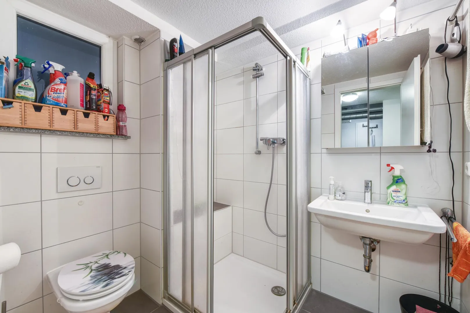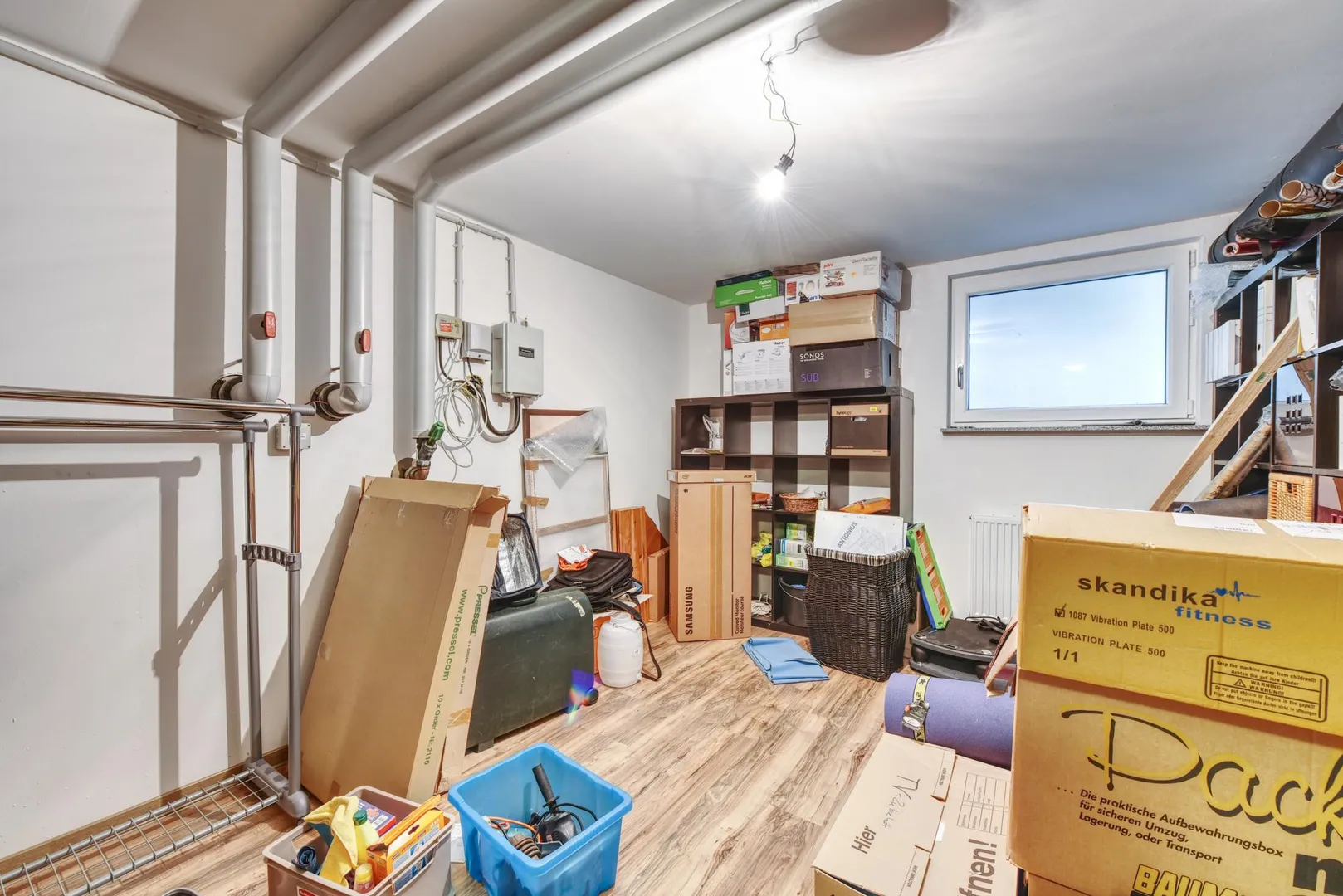 Im Untergeschoss befinden sich auf ca. 79 m² Wohn- und Nutzfläche zwei Zimmer (nach Süden ausgerichtet mit extra großen Fenstern und Lichtschächten, ca. 24 m² Wohnfläche), zwei Hobbyräume (nach Norden ausgerichtet, ca. 26 m² Nutzfläche), die Haustechnik, ein Badezimmer sowie ein Abstellraum. Die Raumhöhen betragen ca. 2,34 Meter. Die Zimmer, die Hobbyräume sowie der Abstellraum sind mit Lamiantböden, Heizkörpern, Fenstern und Lichtschächten ausgestattet. Das raumhoch geflieste Badezimmer mit Fenster ist ausgestattet mit einem Fliesenboden, einer bodentiefen Dusche sowie einem WC.