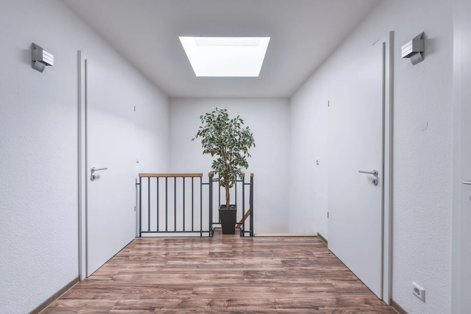 Das Haus ist ausgestattet mit Vollwärmeschutz, isolierverglasten Kunststofffenstern mit Rollläden (im Erdgeschoss elektrisch und programmierbar), Fernwärme-Zentralheizung mit Wärmerückgewinnung, kontrollierte Wohnraumbelüftung sowie Kabelanschluss.