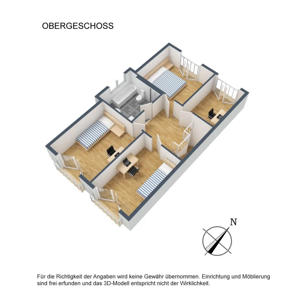 Im Obergeschoss (Dachgeschoss) befinden sich auf ca. 60 m² Wohnfläche vier Zimmer sowie ein Badezimmer. Alle Zimmer sind mit französischen Balkonen, Laminatböden sowie Raufasertapeten ausgestattet. Das raumhoch geflieste Badezimmer mit Fenster ist ausgestattet mit einem Fliesenboden, einer Badewanne, einer bodentiefen Dusche, einem WC sowie einem Waschmaschinen-Anschluss. Die Raumhöhen betragen ca. 2,40 bis 2,50 Meter.