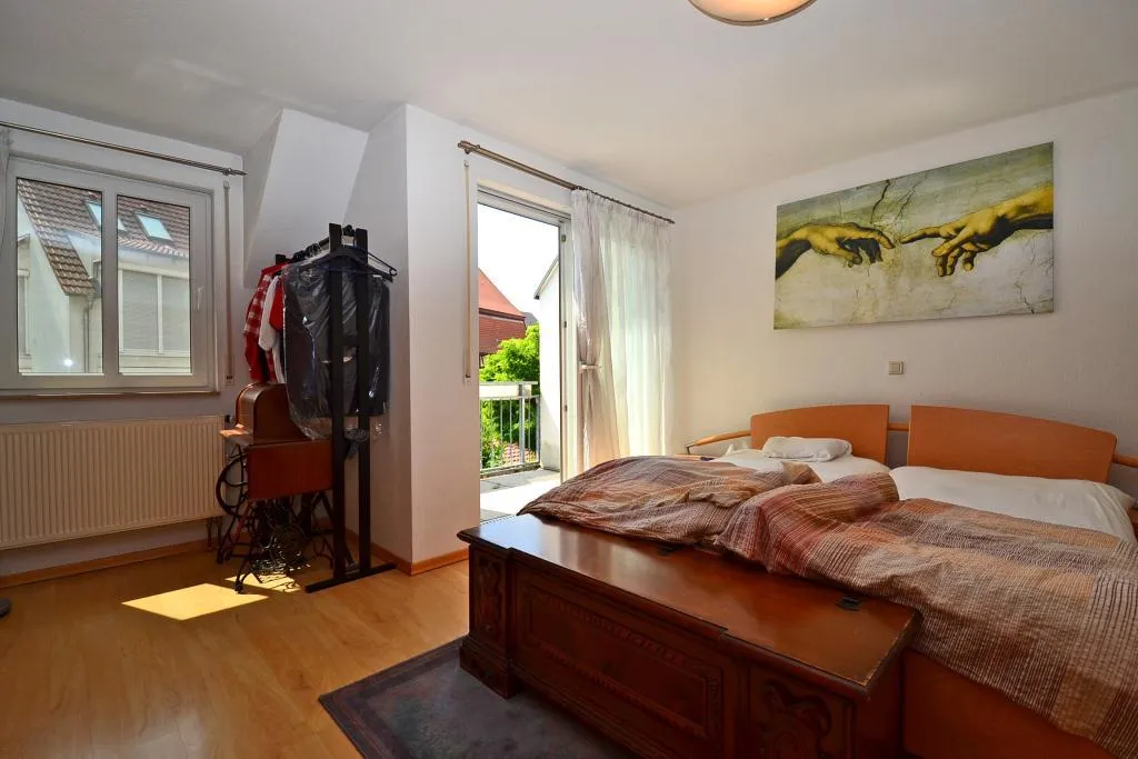 Obergeschoss: Schlafzimmer mit Balkon, Kinderzimmer, Tageslicht-Bad mit WC/Wanne/Dusche/2 Waschbecken und Abstellraum.