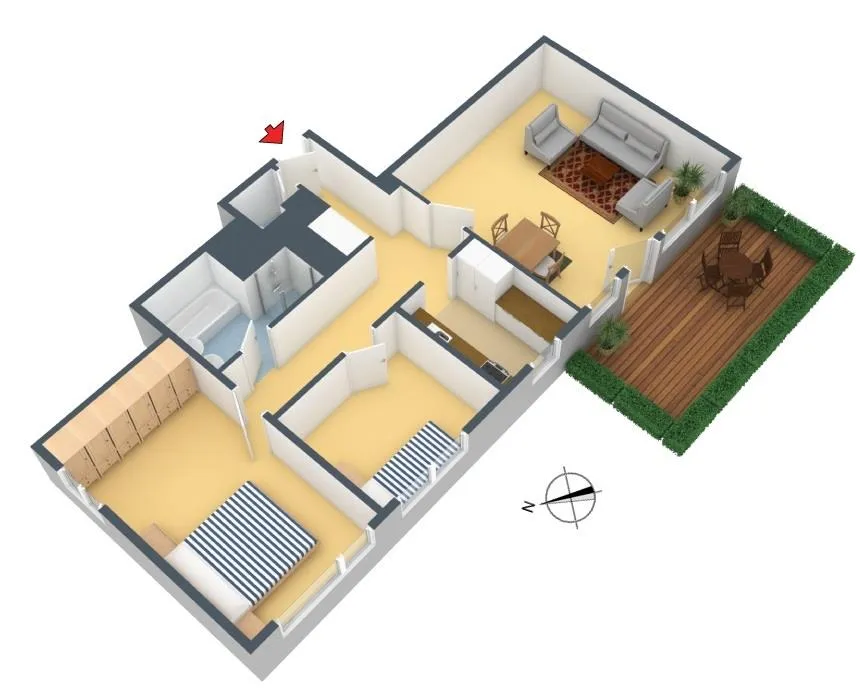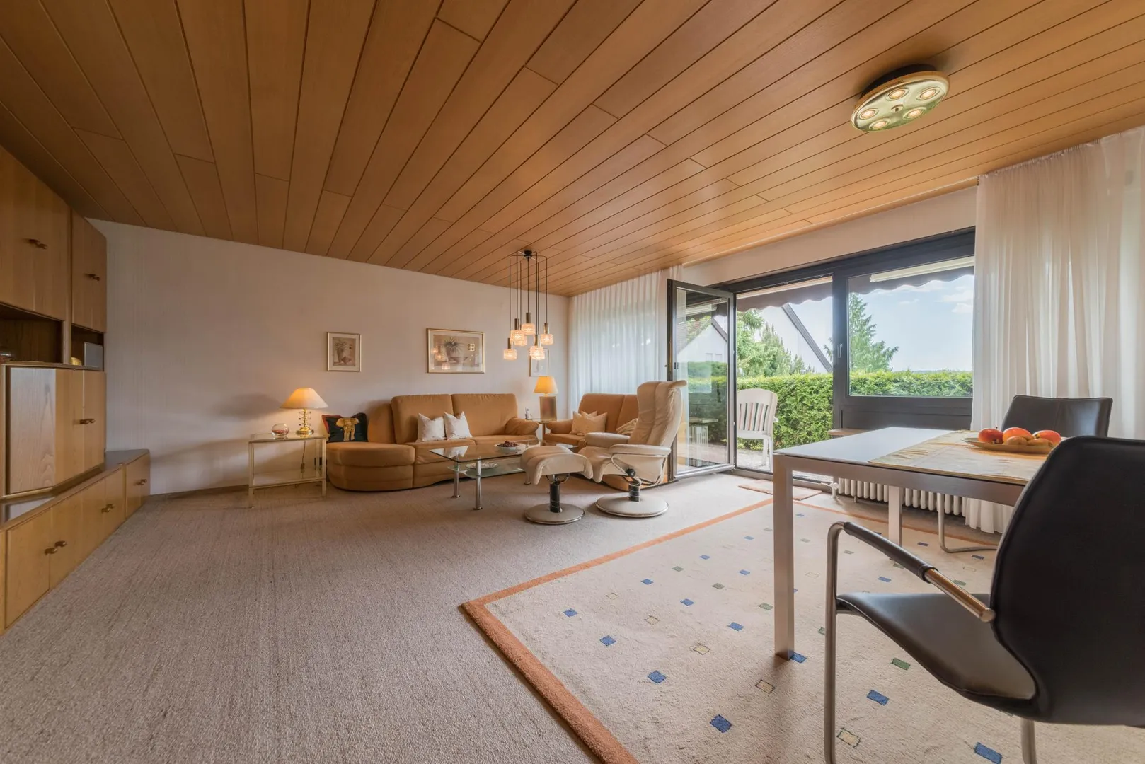 Der Grundriss ist gut. Alle Räume sind direkt vom Flur begehbar. Das WC ist separat. Die ca. 11 m² teilüberdachte Süd/West-Terrasse mit einer elektrischen Markise ist über das Wohnzimmer begehbar.