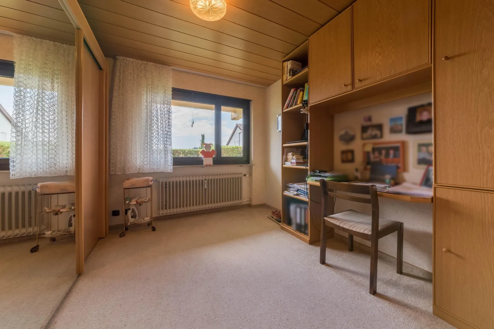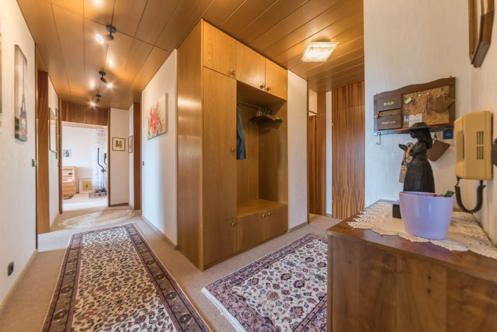 Die Böden in den Zimmern und im Flur sind mit Teppichen ausgestattet. Auf den Böden in der Küche, im Badezimmer sowie im WC sind PVC-Böden ausgelegt. Die Decken sind mit Holz-Paneelen verkleidet. Im Flur befindet sich ein Einbauschrank.