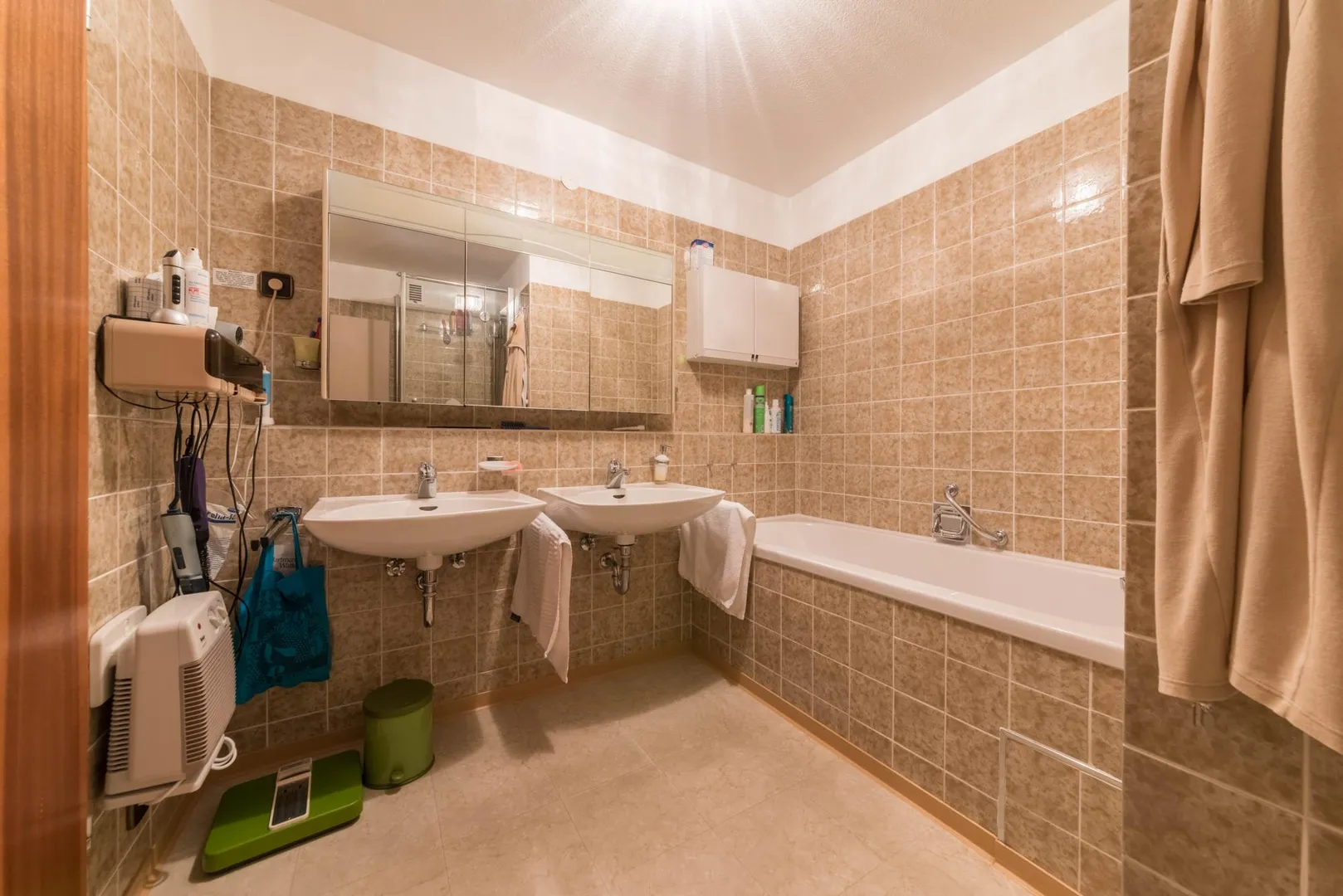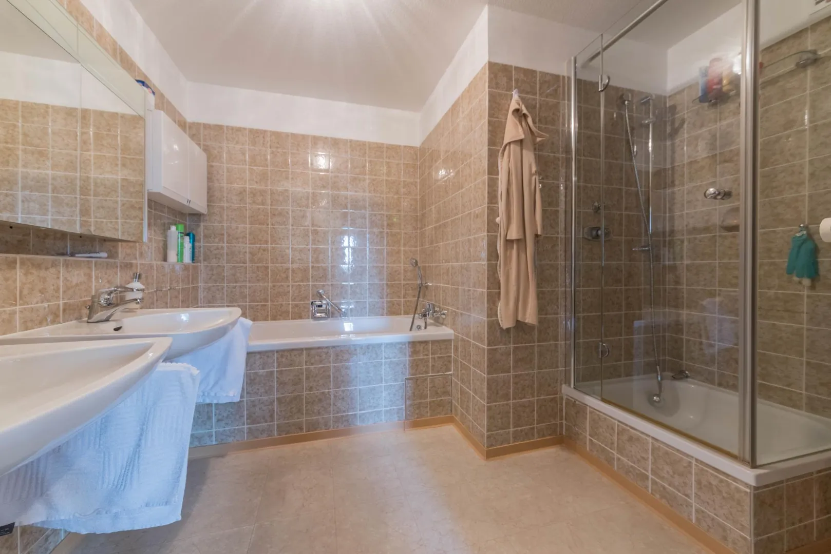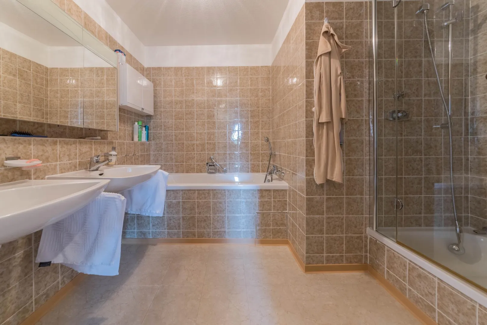 Das 2/3-hoch geflieste Badezimmer ist ausgestattet mit einer Badewanne, einer Dusch sowie zwei Waschbecken.