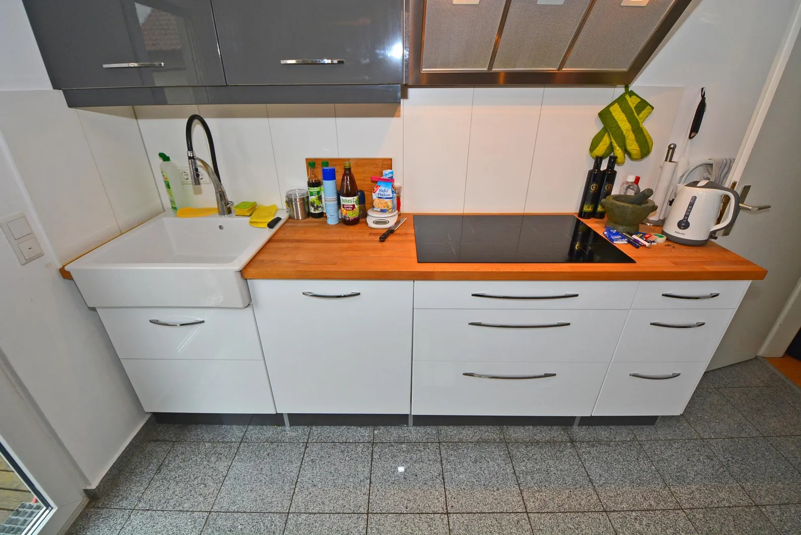 In der Küche wurde ein Granit-Fliesenboden verlegt.