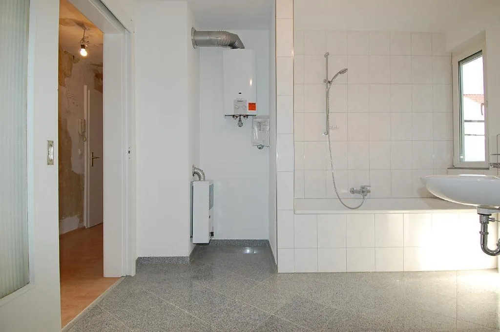 Das geflieste Tageslicht-Badezimmer wurde ca. 2009 komplett modernisiert und ist ausgestattet mit einem Granit-Fliesenboden, einer Badewanne, einem Waschmaschinenanschluss und einer Schiebetür.