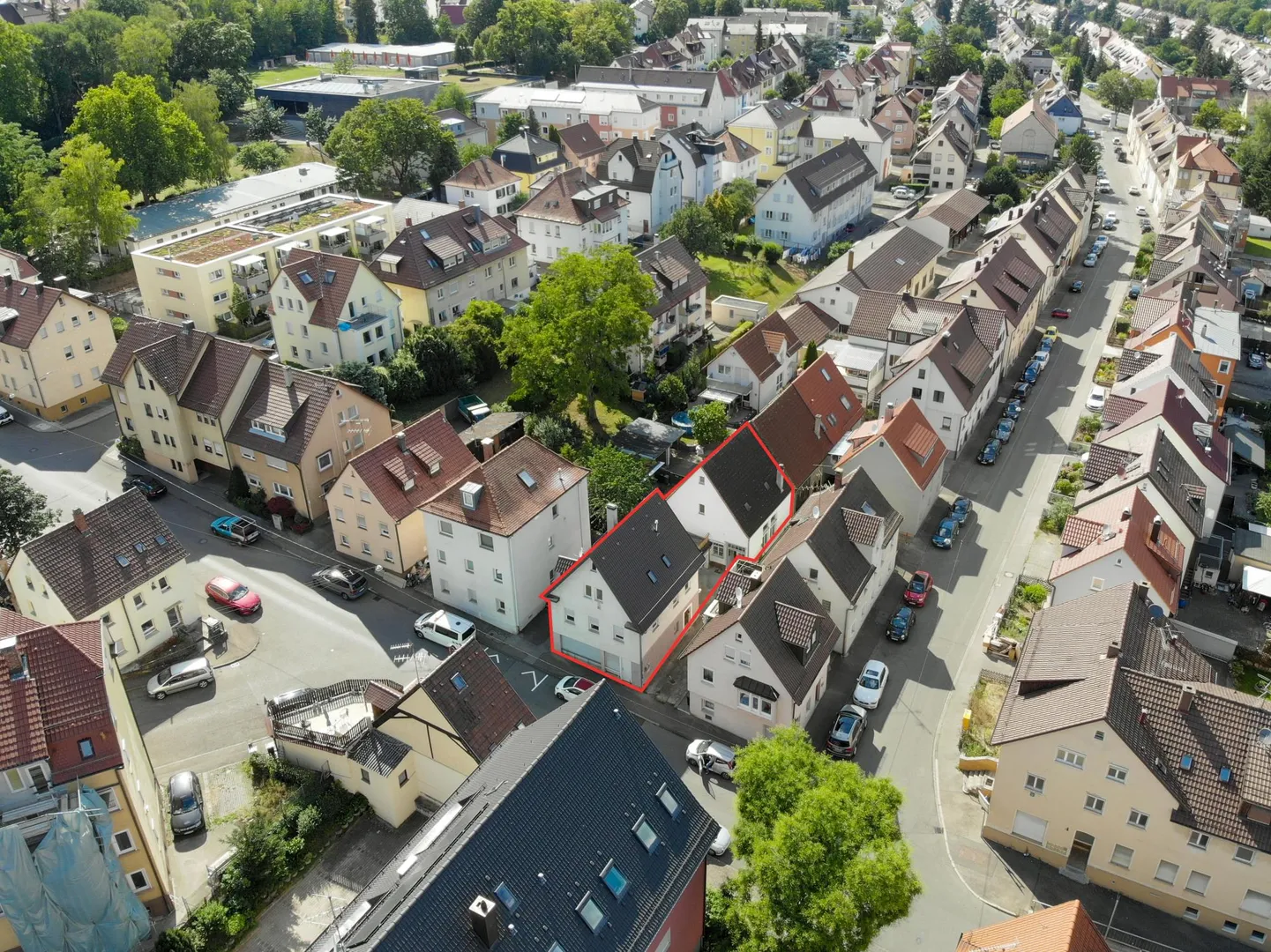 Die Gebäude stehen an den anderen Grundstückseiten auf den Grundstücksgrenzen.