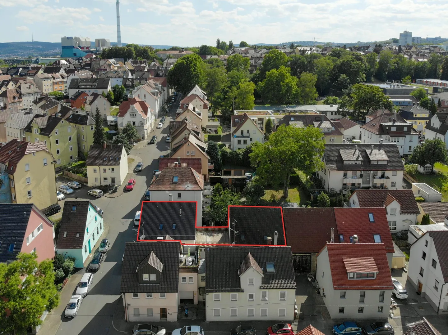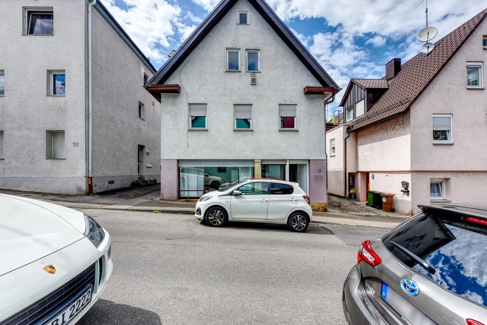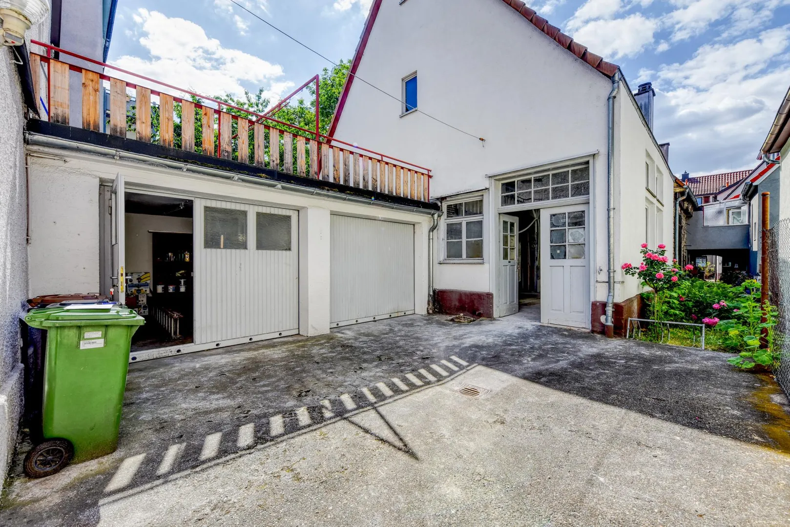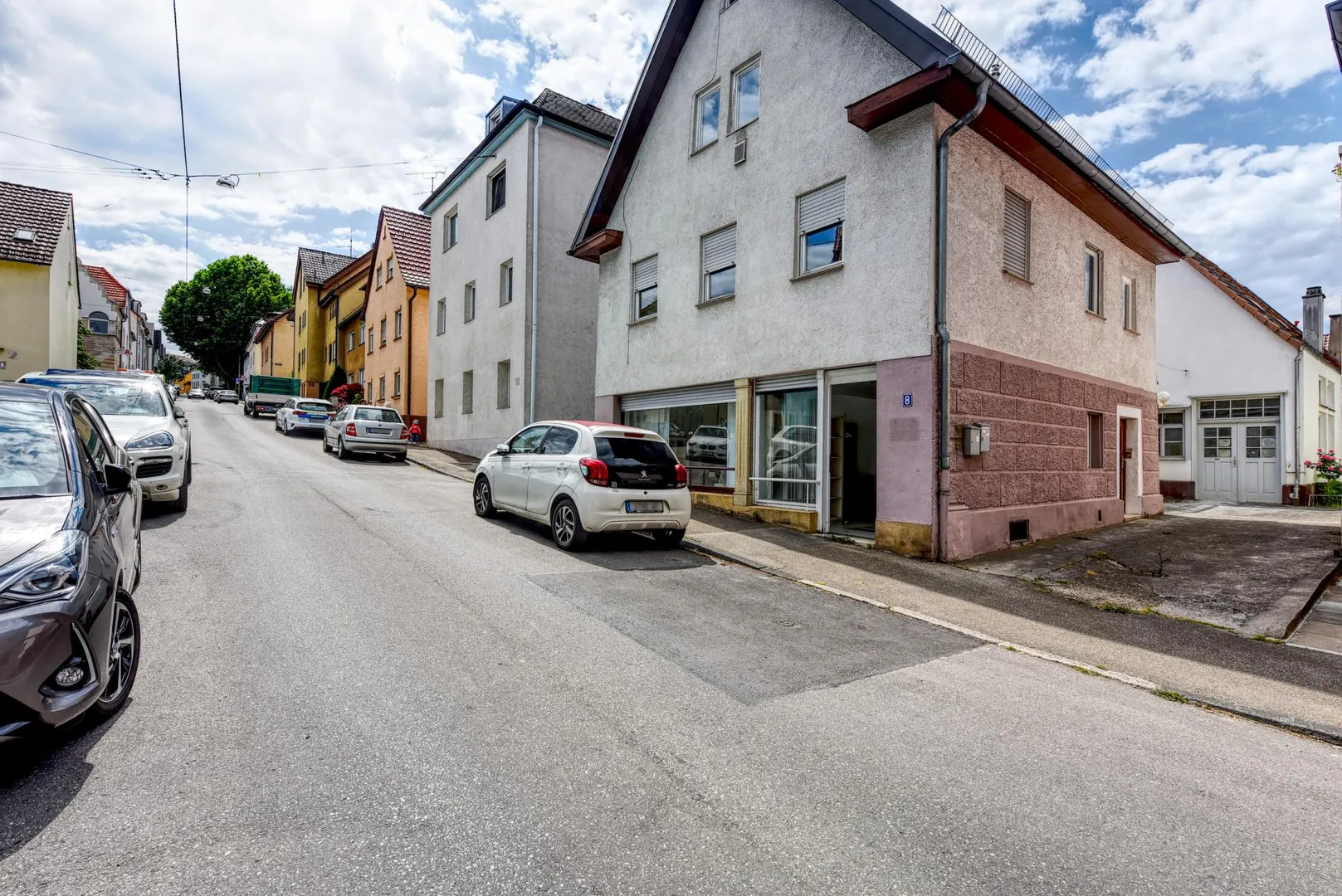 Auf dem 261 m² großen Grundstück befinden sich ein Wohn- und Geschäftshaus (Vorderhaus), ein Garagen-Zwischenbau sowie eine Werkstatt (Rückgebäude).
