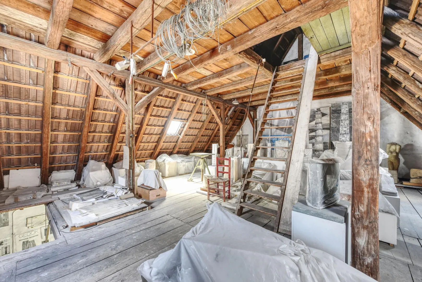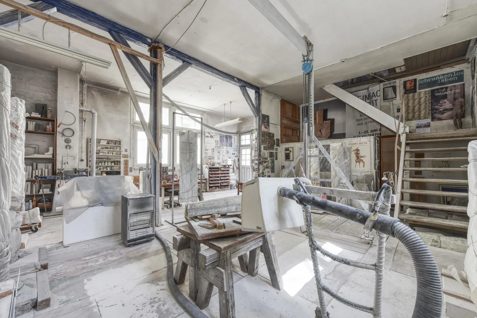 Die Werkstatt hat eine Gesamt-Nutzfläche von ca. 161 m². Der Gewölbekeller ist ca. 27 m² groß, das Erdgeschoss hat ca. 67 m², das Dachgeschoss ca. 54 m² und die Bühne ca. 14 m². Die Beheizung erfolgt über einen Öl-Einzelofen, zwei Öl-Tanks sind im Gewölbekeller. Die Raumhöhen betragen im Gewölbekeller ca. 2,72 Meter, im Erdgeschoss ca. 3,66 Meter, im Dachgeschoss ca. 2,87 Meter sowie auf der Bühne ca. 2,36 Meter.