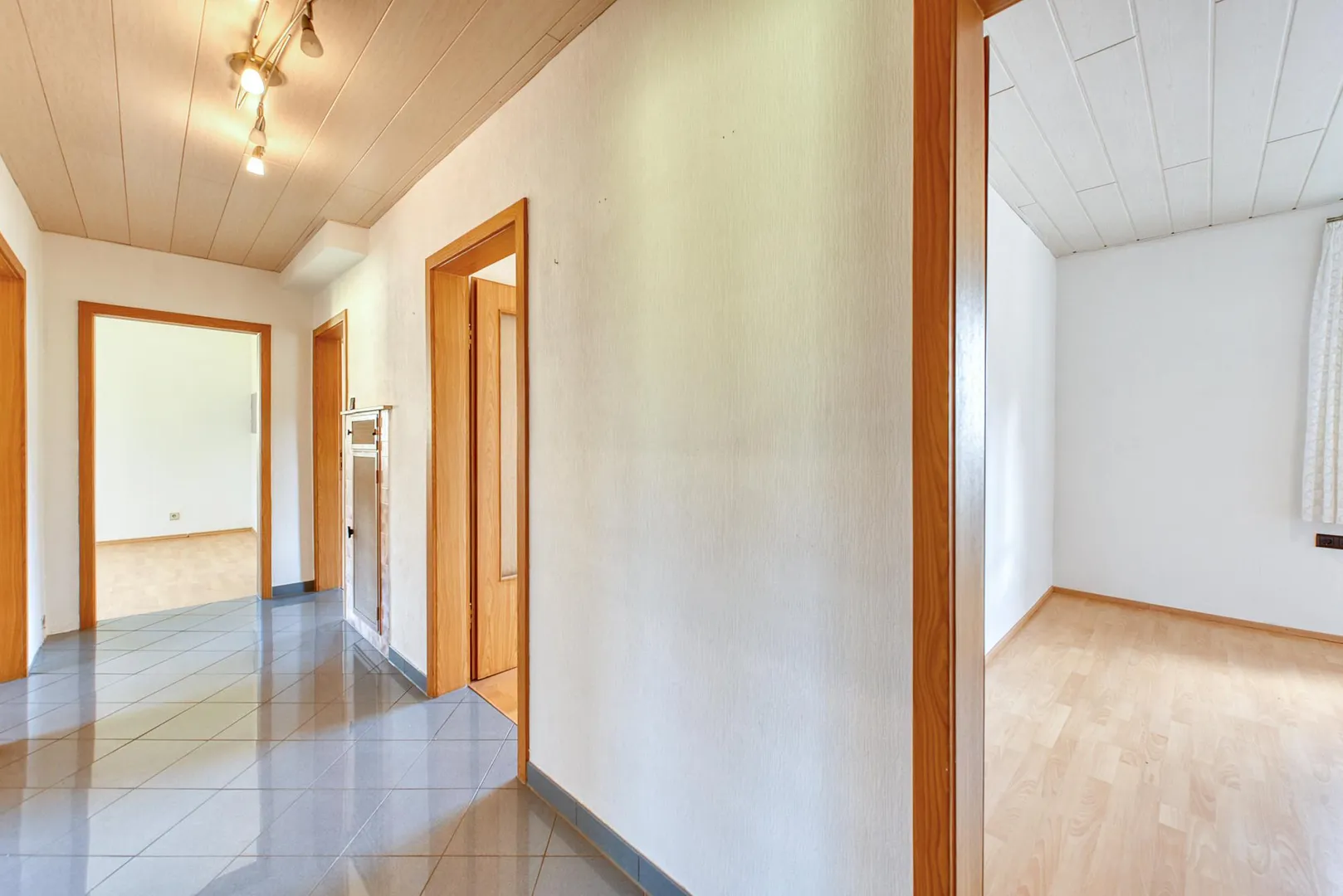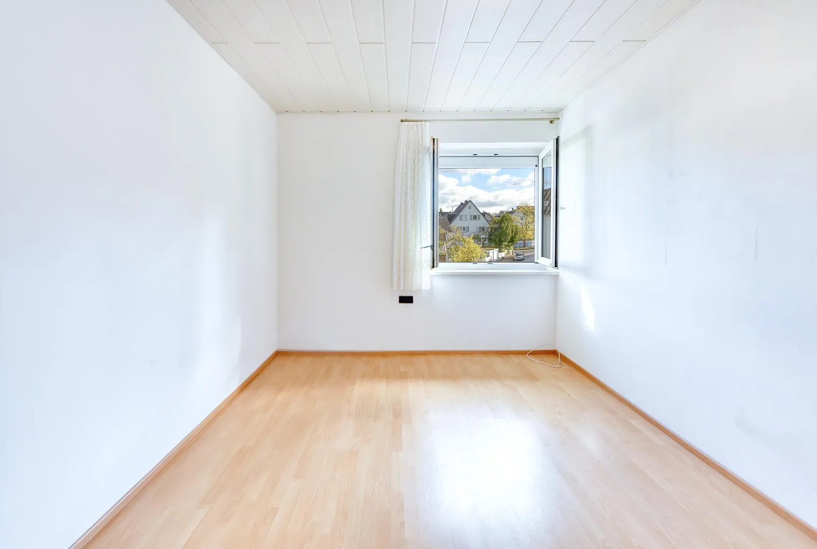 Im Wohnzimmer sowie im Essbereich ist Parkettboden verlegt. Im Schlafzimmer sowie im Kinderzimmer ist Laminat verlegt. Die Böden im Flur, in der Küche, im Badezimmer sowie im separaten WC sind gefliest.