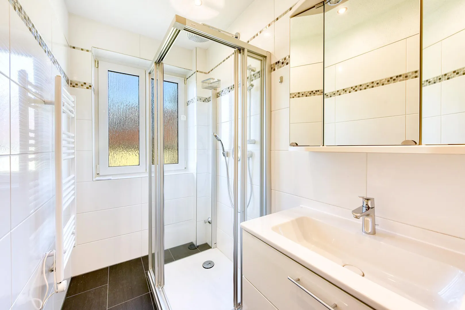 Das überwiegend raumhoch und teilweise 2/3-hoch geflieste Tageslicht-Badezimmer ist ausgestattet mit einer abgehängten Halogen-Decke, einer Dusche, einem Handtuch-Heizkörper, einem Waschtisch-Unterschrank sowie einem Spiegel-Schrank.