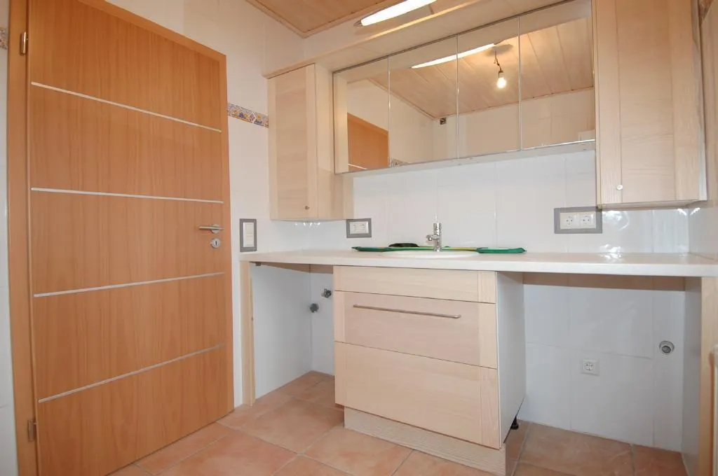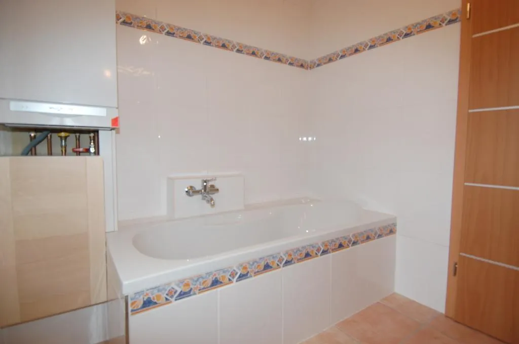 Das Badezimmer verfügt über ein Fenster und ist raumhoch gefliest. Das Badezimmer ist ausgestattet mit einer Wanne, einem Waschbecken und Badmöbeln. Die Badewanne wird noch mit einer Duschtrennwand versehen. Im Badezimmer befindet sich auch der Waschmaschinenanschluss.