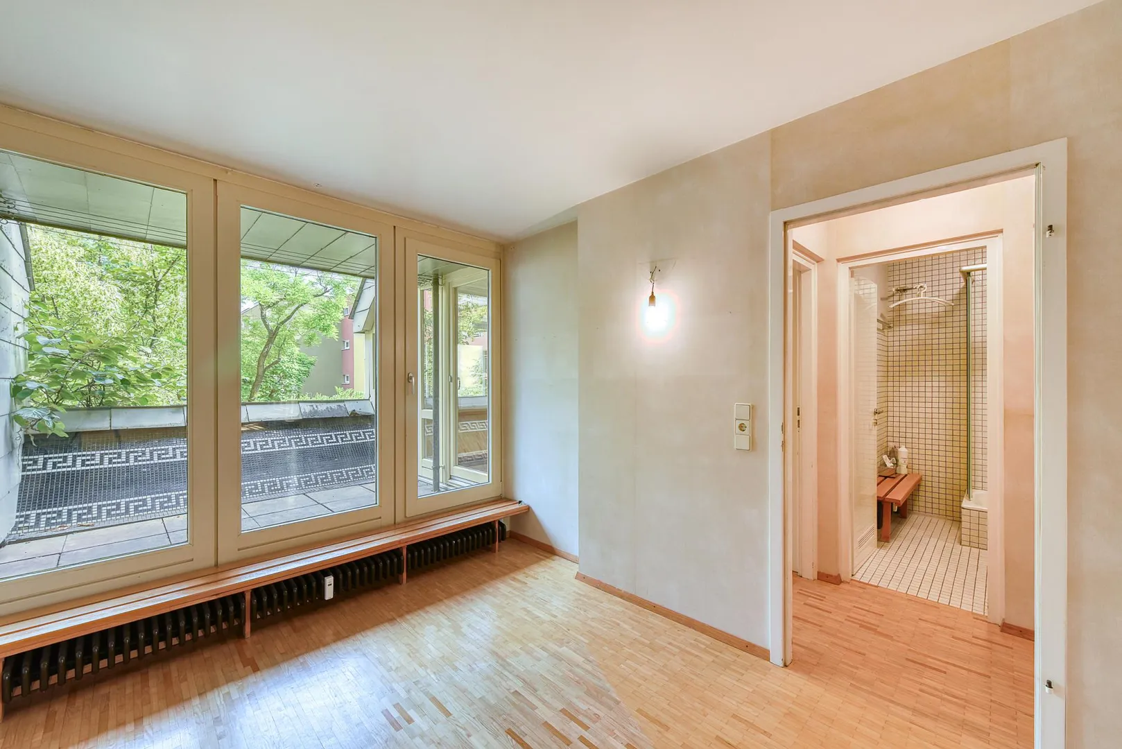 Die ca. 26 m² große und teilüberdachte Nord/West-Terrasse mit elektrischem Beschattungssystem ist begehbar über den Wohnbereich, den Flur sowie über das Schlafzimmer.