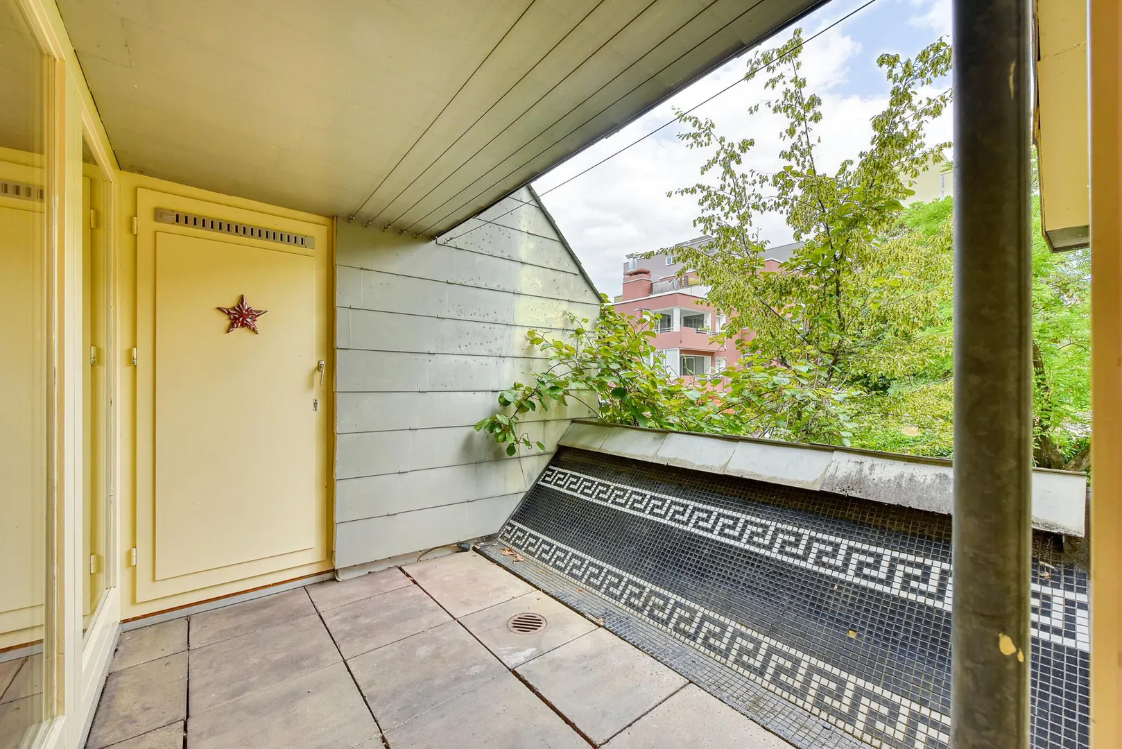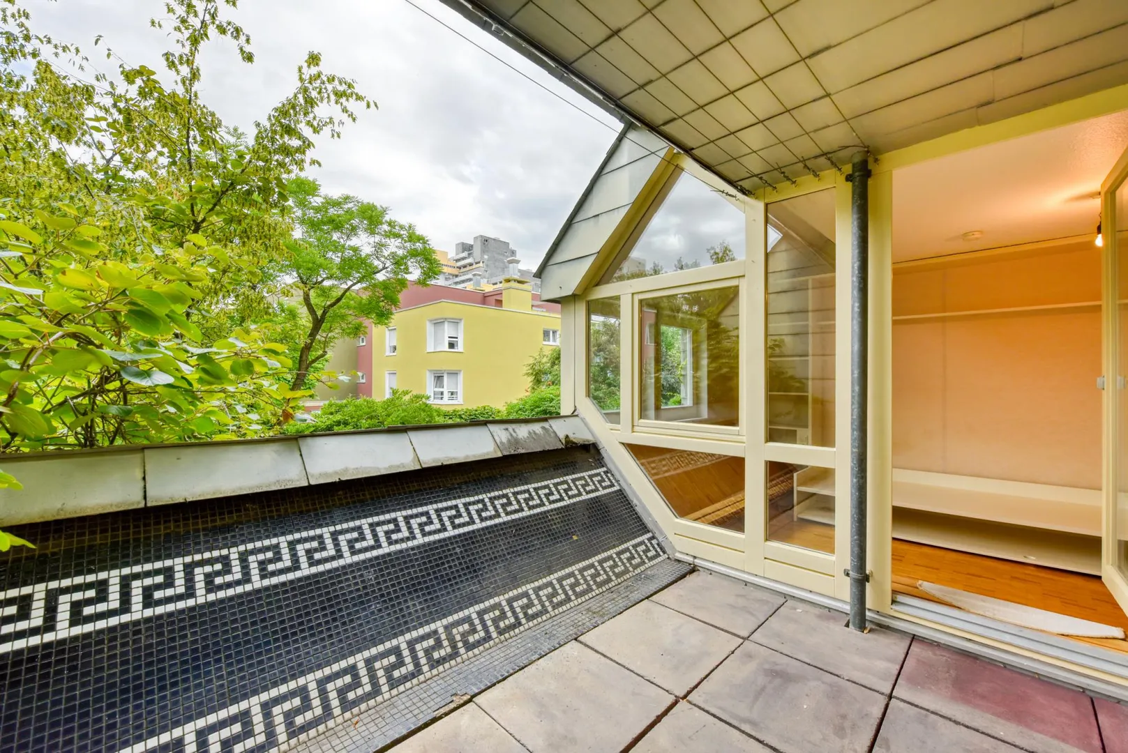 Der ca. 8 m² große und teilüberdachte Süd/Ost-Balkon ist begehbar über den Arbeitsbereich sowie über das Kinderzimmer.