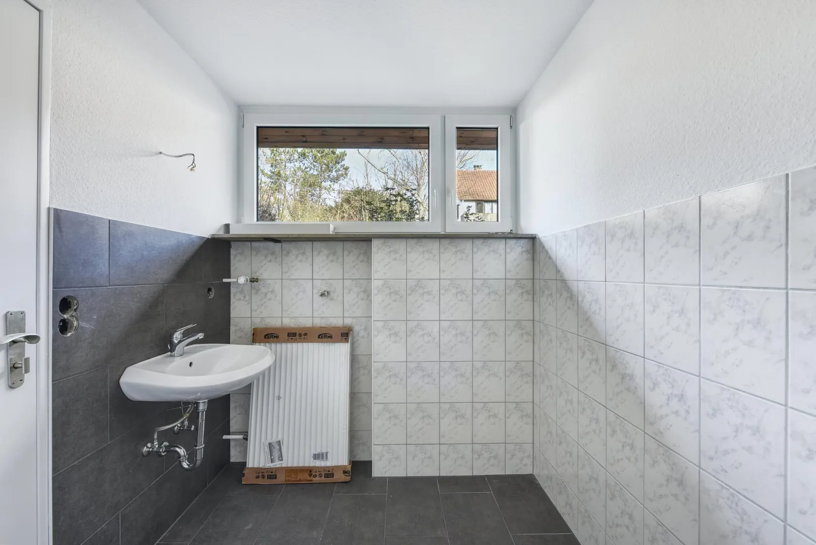 2 Zimmer mit Laminatböden, Kunststofffenster von 2015, Raufasertapeten und Holzdecken; ein raumhoch gefliestes Badezimmer mit Fenster, Fliesenboden, Dusche und WC. Eine Küche mit einer Küchenzeile, welche als Durchgang zum gemeinschaftlichen Wasch-/Trockenraum sowie zum Abstellraum der Dachgeschoss-Wohnung genutzt wird. Die Raumhöhe beträgt ca. 2,19 Meter.