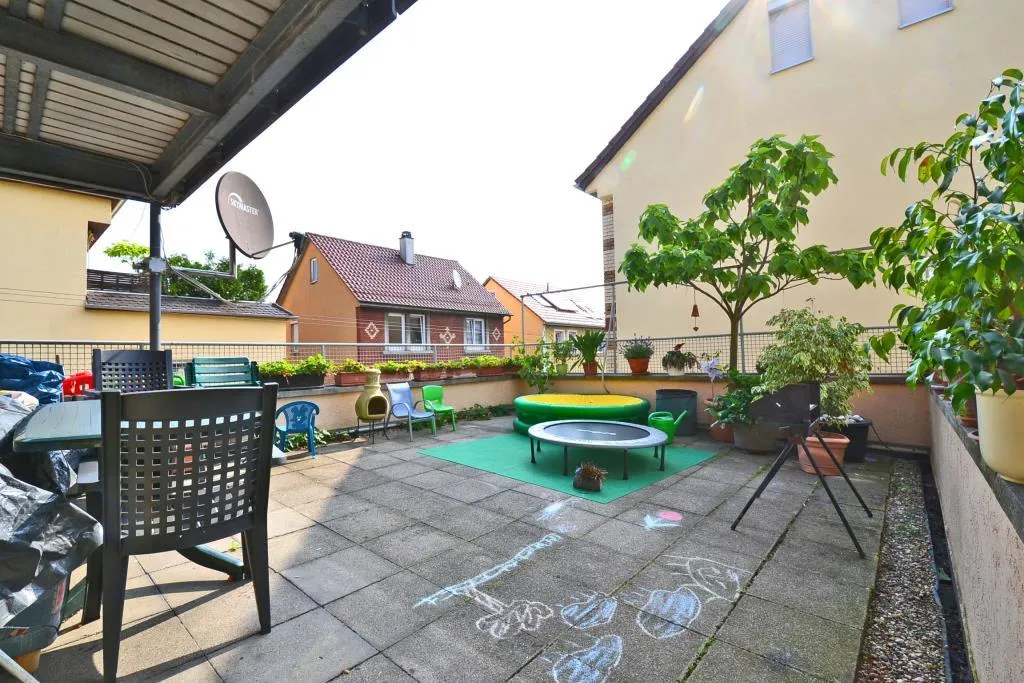 Diese modernisierte und renovierte 3-Zimmer-Etagen-Wohnung mit großer Terrasse befindet sich im 1. Obergeschoss eines freistehenden 4-Familienhauses.