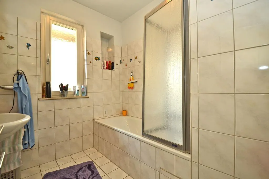 Das halbhoch geflieste Badezimmer mit Fenster wurde ca. 1997 modernisiert und ist ausgestattet mit einem Fliesenboden, einer Badewanne sowie einem Handtuchheizkörper.