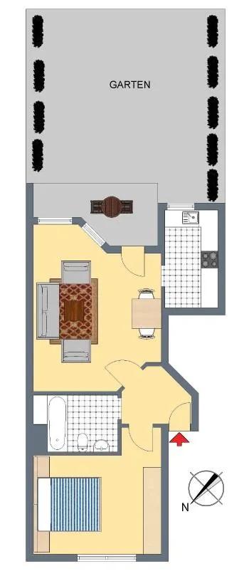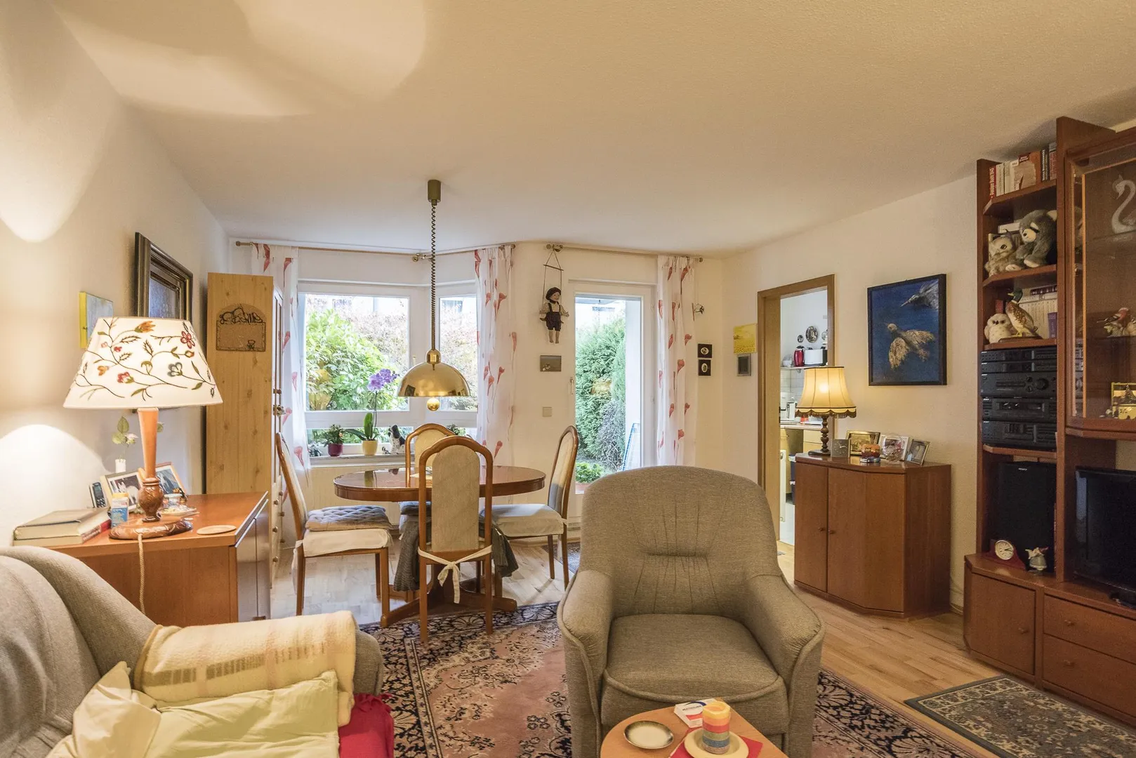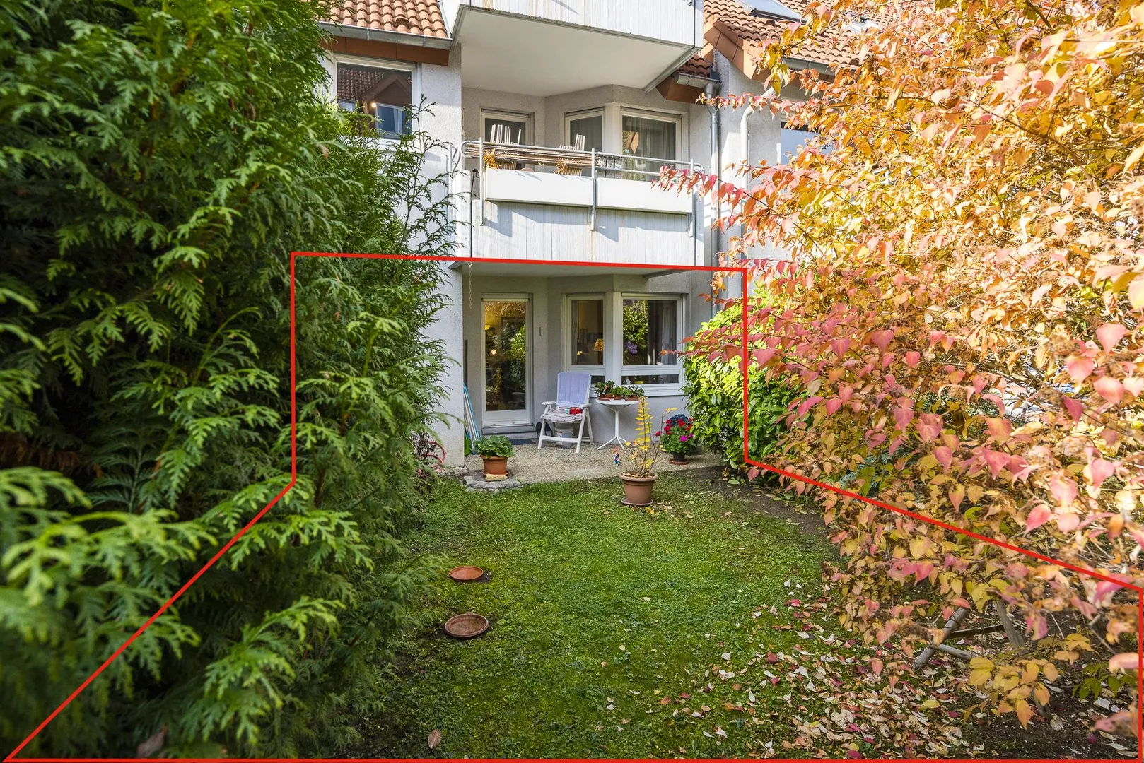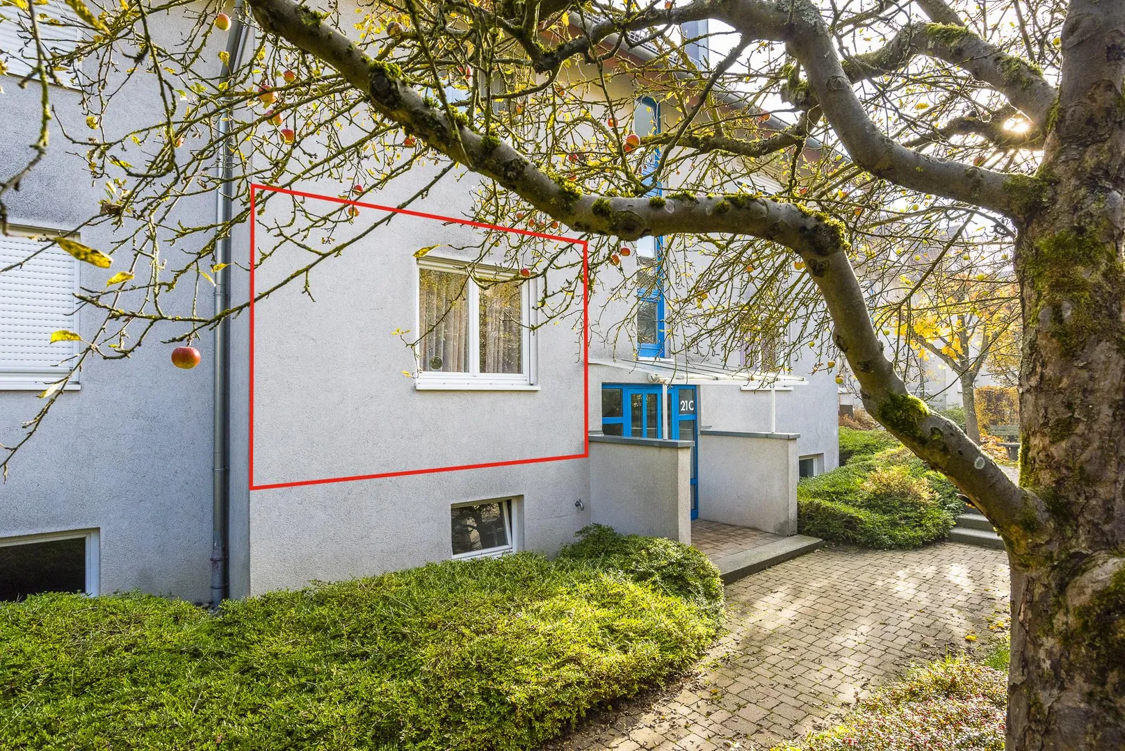 Diese solide vermietete 2-Zimmer-Wohnung mit Terrasse und Garten befindet sich im Hochparterre (Erdgeschoss).