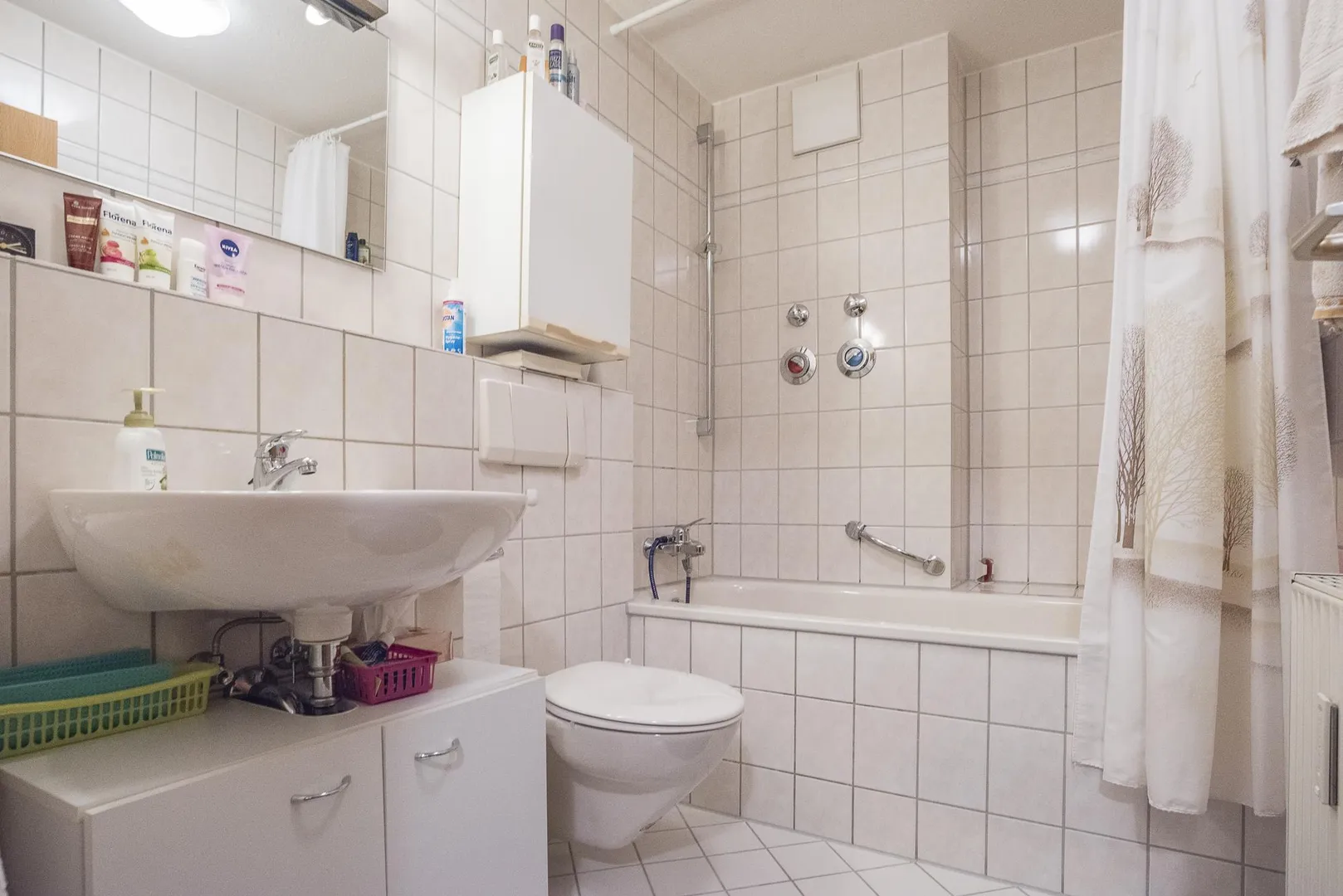 Das raumhoch geflieste Badezimmer ist mit einer Badewanne, einem Waschbecken, einem WC sowie einer Lüftung ausgestattet.