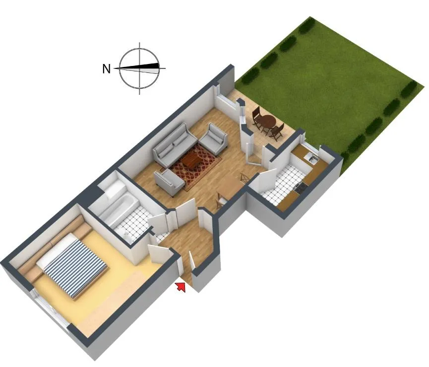 Das Wohnzimmer und die Küche sind nach Südosten, das Schlafzimmer ist nach Nordwesten ausgerichtet.
