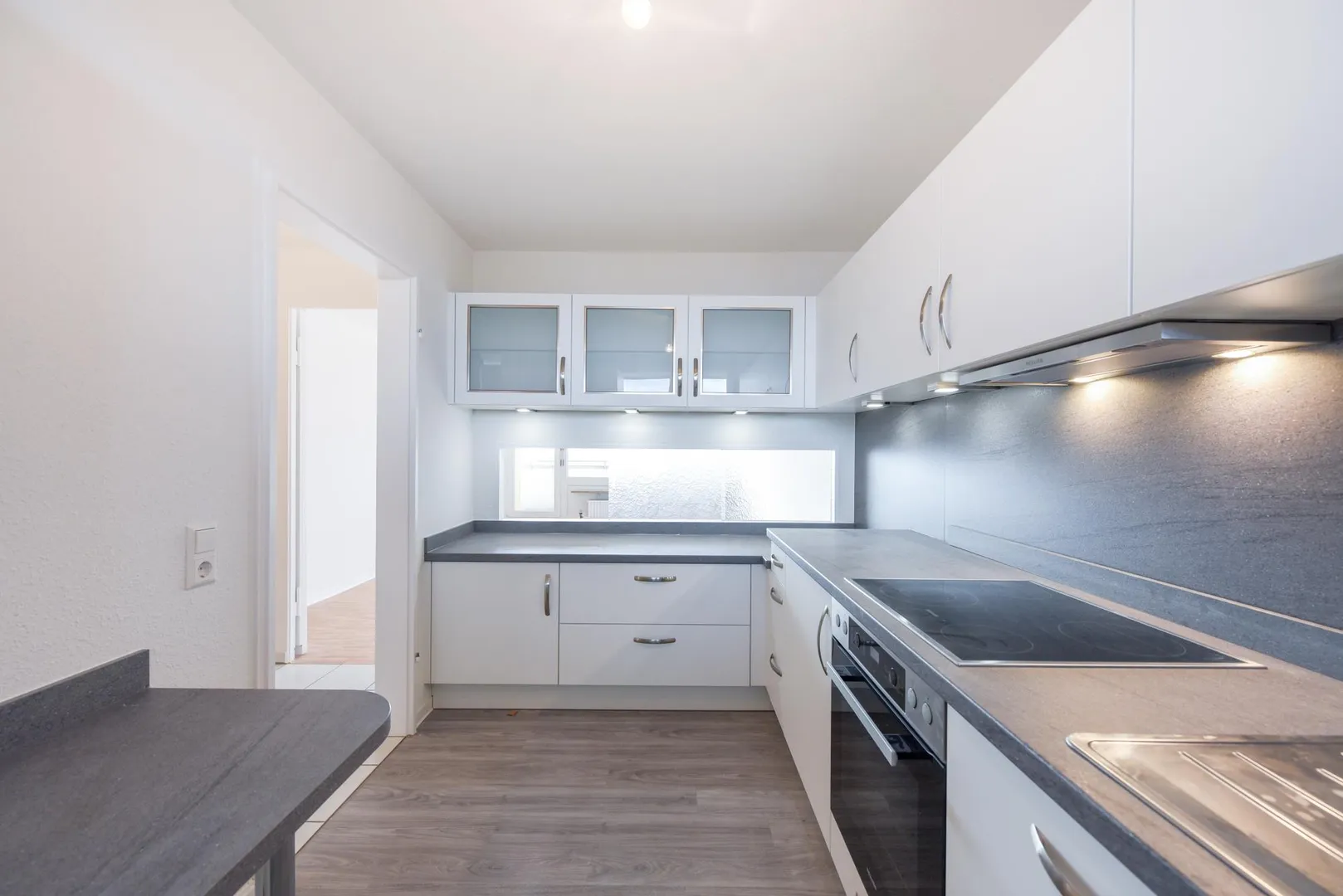 Die Küche ist ausgestattet mit einem Vinyl-Design-Boden, einer Einbauküche und einer Durchreiche zum Wohnzimmer. Die neue Einbauküche verfügt über einen Kühlschrank, einen Gefrierschrank, einen Herd, einen Backofen, einen Dunstabzug, eine Spülmaschine sowie Unter- und Oberschränke. Der monatliche Mietpreis für die EBK iHv. 85 EUR ist bereits in der Angabe der Kalt-Miete enthalten.