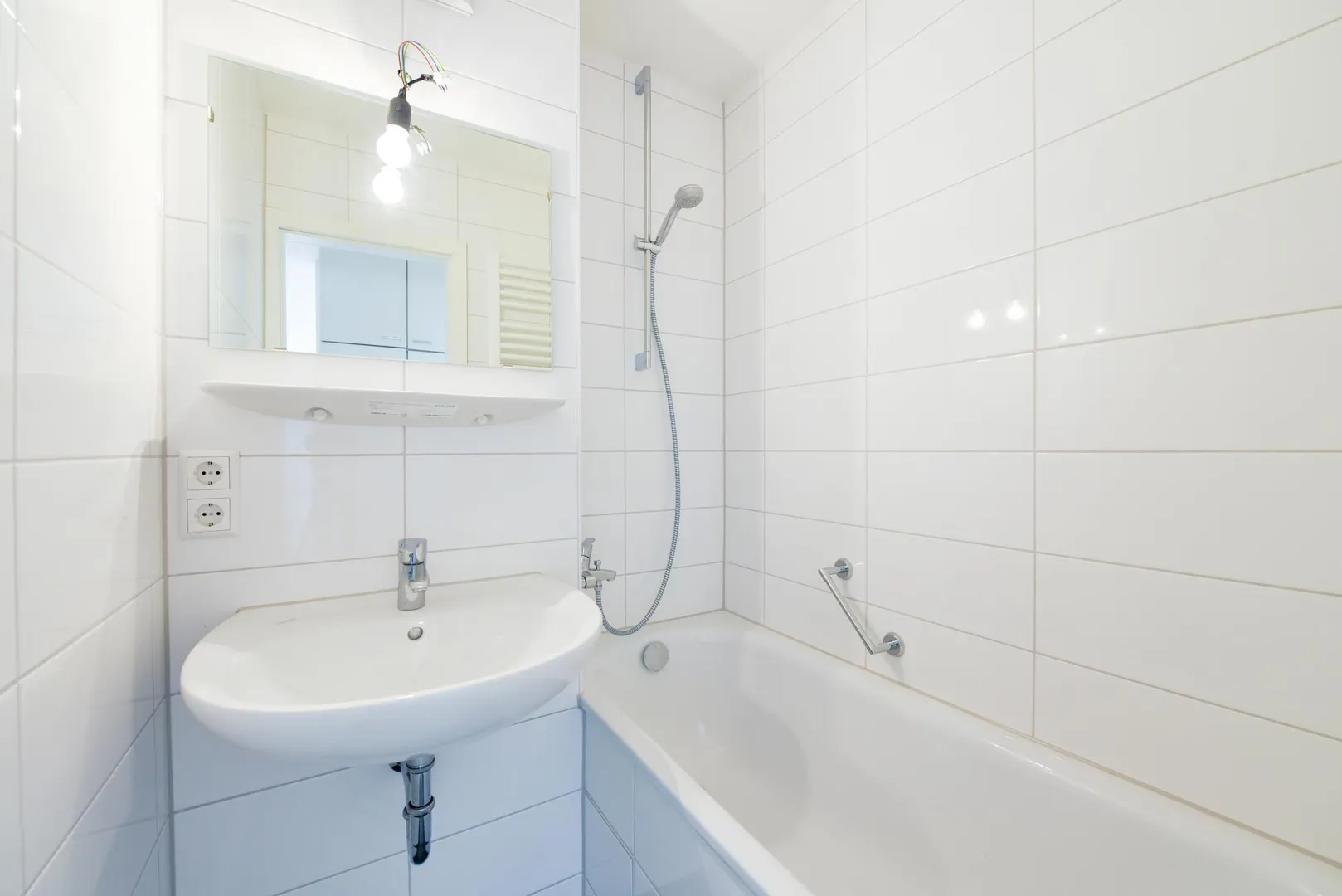 Das raumhoch geflieste Badezimmer ist ausgestattet mit einer Badewanne sowie einem Handtuch-Heizkörper.