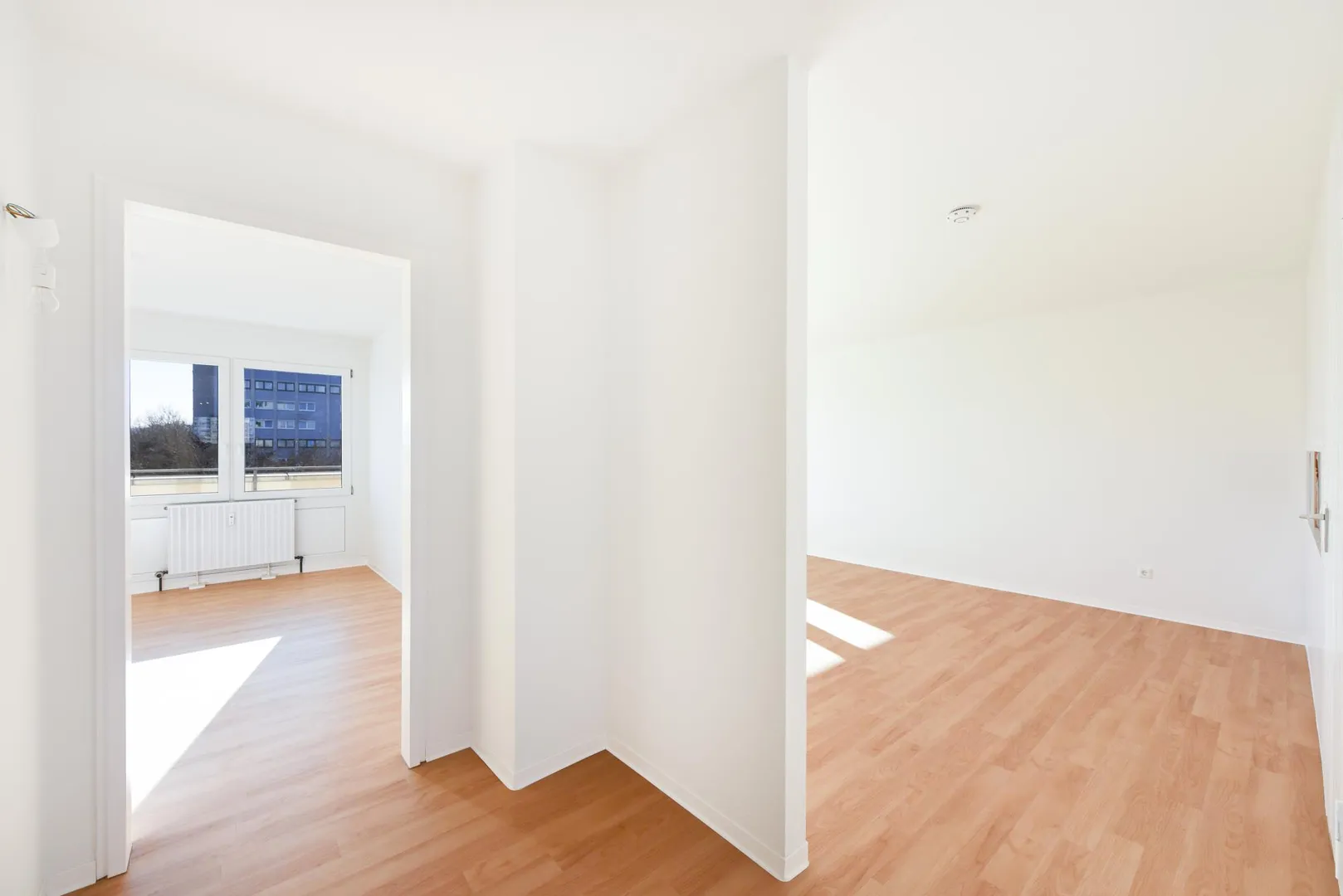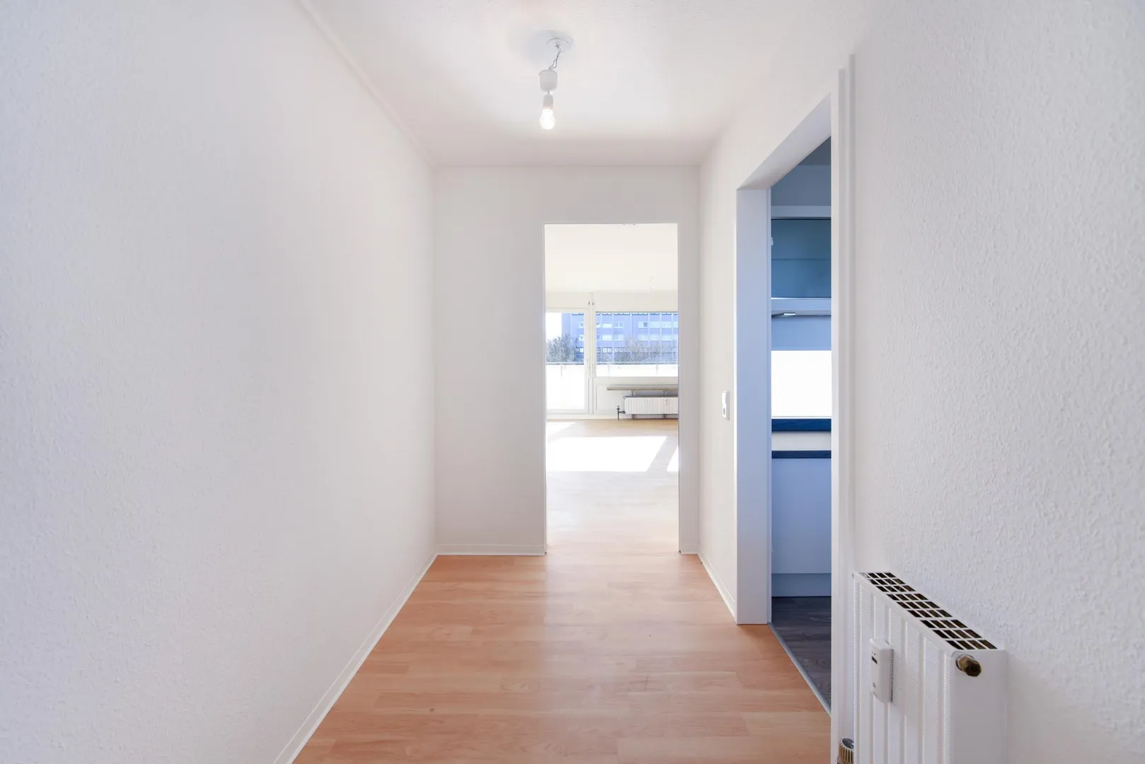 Die Wände sind überwiegend mit Raufasertapeten tapeziert und frisch, weiß gestrichen. Die Raumhöhen betragen ca. 2,42 Meter.