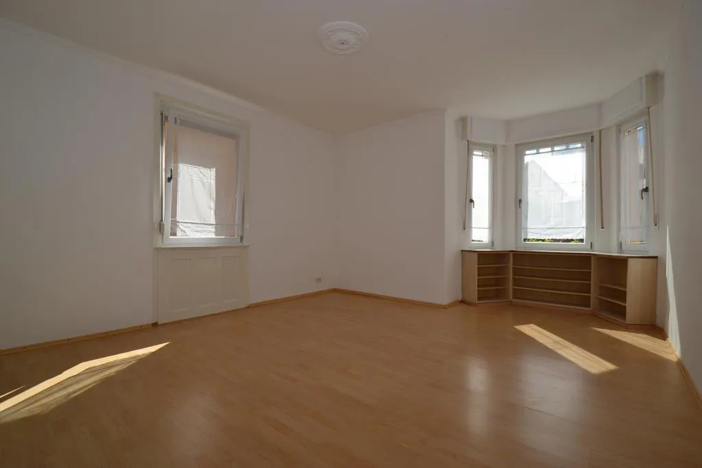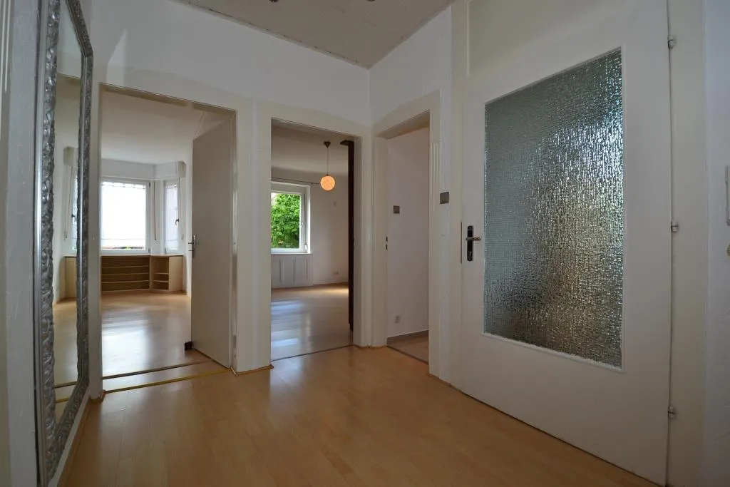 Hochparterre: 3-Zimmer-Etagen-Wohnung, leerstehend, ca. 80 m² Wohnfläche. Modernisierung ca. 2007, Kunststofffenster mit Rollläden, Laminatböden, TL-Bad mit Wanne, sep. WC mit Fenster, Küche mit EBK, Beheizung über Gas-Kachelofen und Gas-Einzelöfen, keine Heizung und Einbauschrank im Schlafzimmer, Raumhöhen ca. 2,80 Meter, Erker im Wohnzimmer.