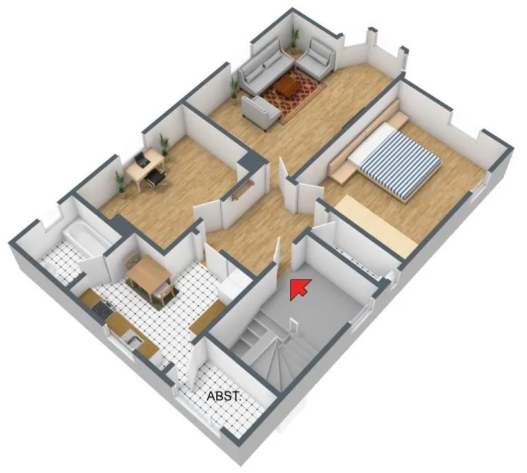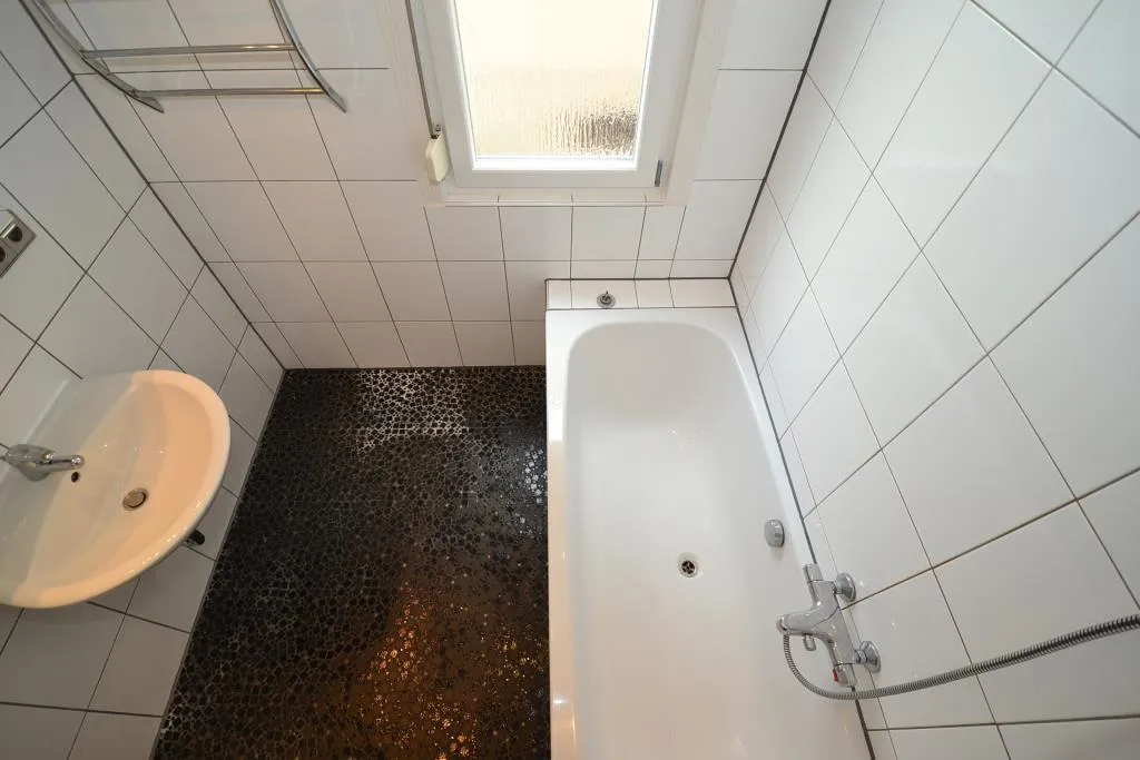 Dachgeschoss: 2-Zimmer-Etagen-Wohnung, ca. 45 m² Wfl. nach DIN, Ausbau vermutlich ca. 2003, Bauantrag wurde nicht gestellt, Kalt-Miete 490 EUR inkl. EBK und Stellplatz, Laminatböden, Bad mit Fenster und Dusche, separates WC mit Fenster, kein Balkon.
