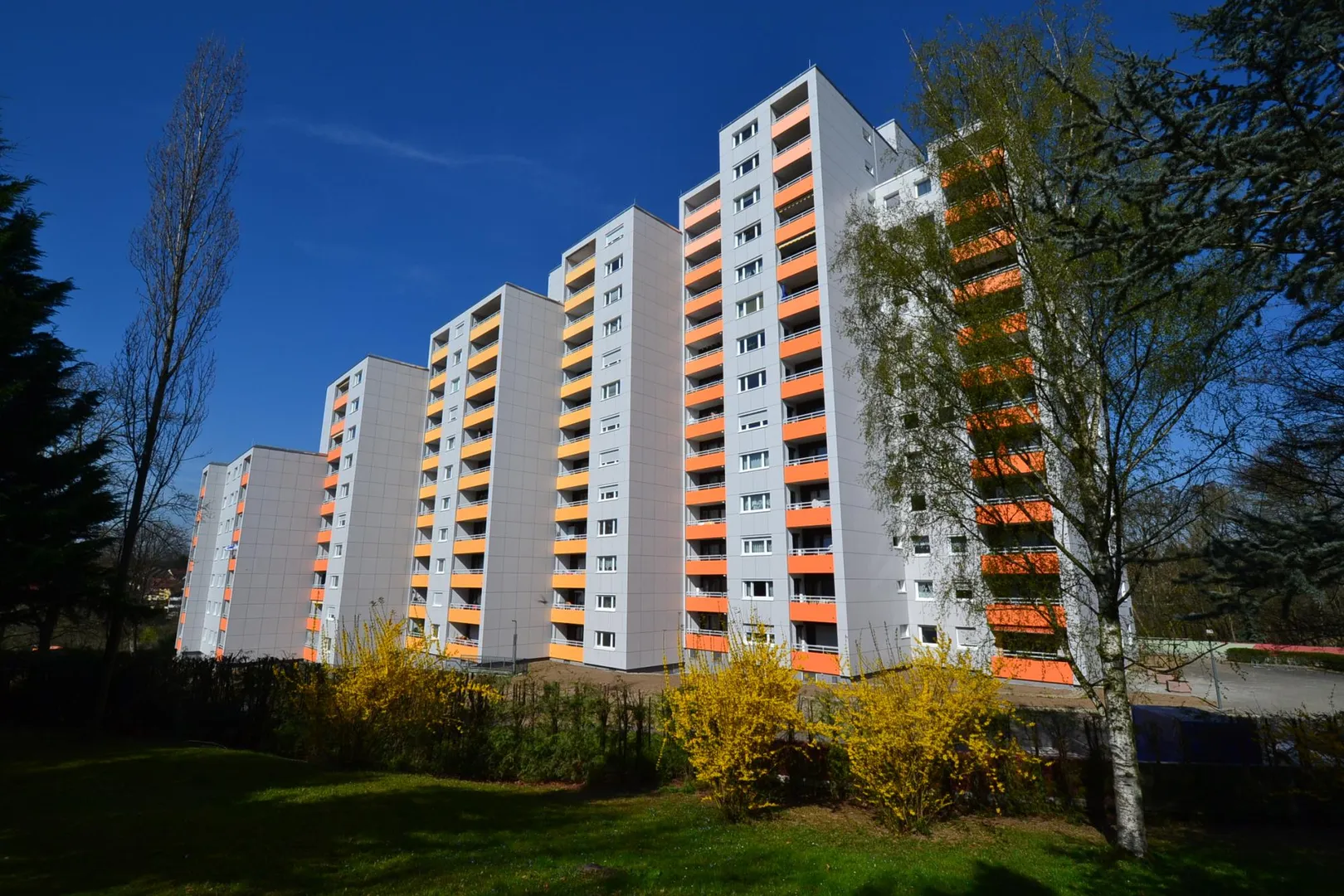 Die Hochhausanlage besteht aus 3 Reihen-Hochhäusern. Die Häuser wurden ca. 1970, massiv, komplett unterkellert und mit Flachdach erstellt.
