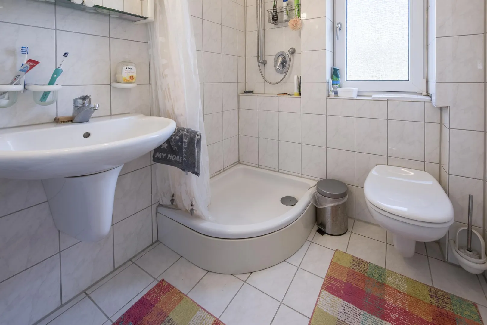 Das raumhoch geflieste Badezimmer mit Fenster ist ausgestattet mit einem Fliesenboden, einer Dusche, einem WC, einem Handtuch-Heizkörper, einem Hängeschrank und einen Spiegelschrank.