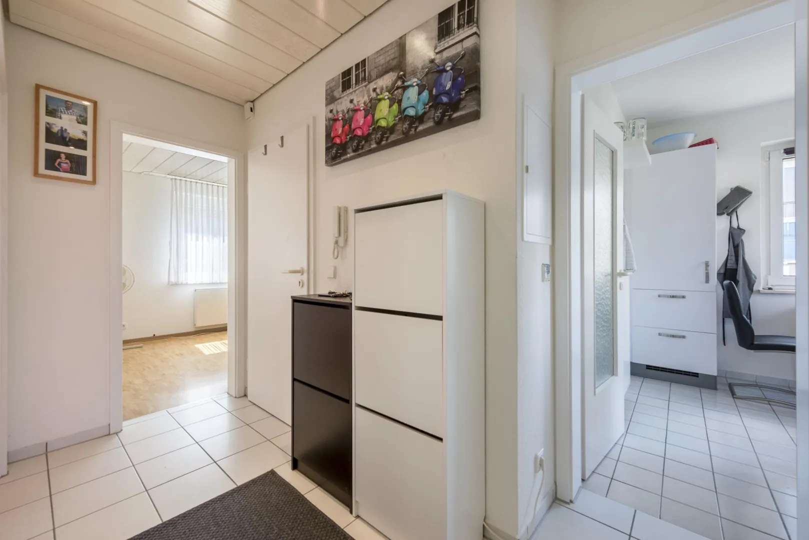 Die Böden in den Zimmer sind mit Parkett ausgestattet. Die Böden im Flur, im Bad und in der Küche sind gefliest.