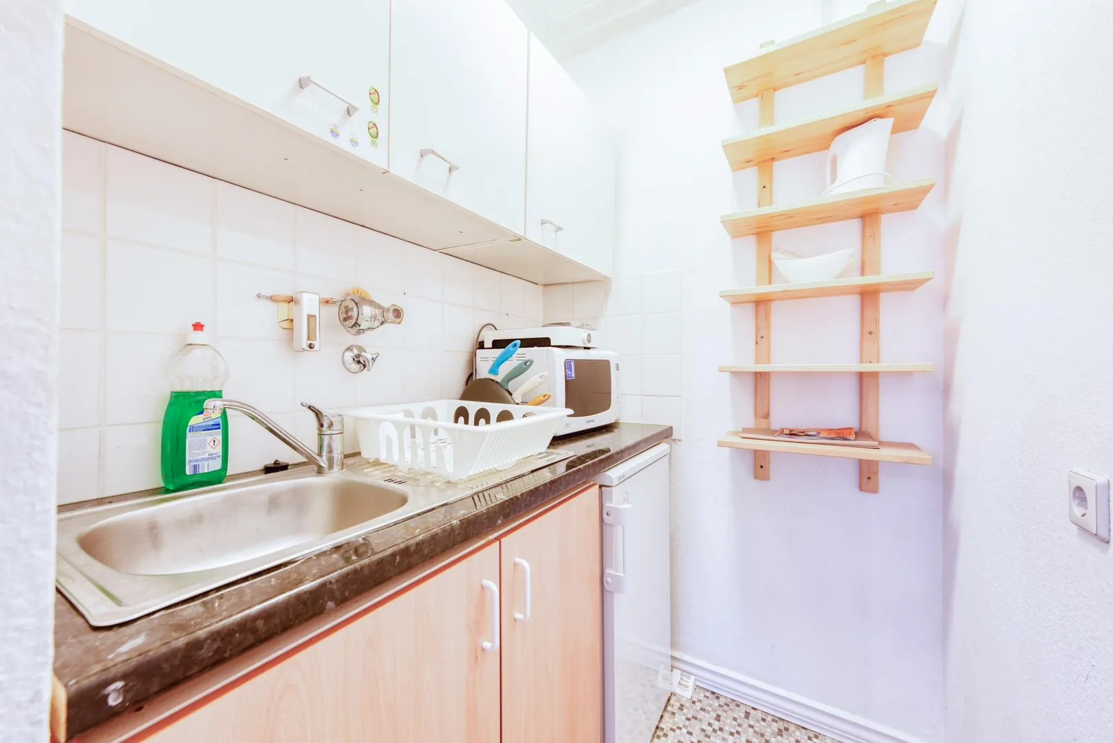 Die kleine Küche verfügt über eine kleine Küchenzeile mit einem Kühlschrank mit Gefrierfach, eine Mikrowelle sowie eine Kochplatte.