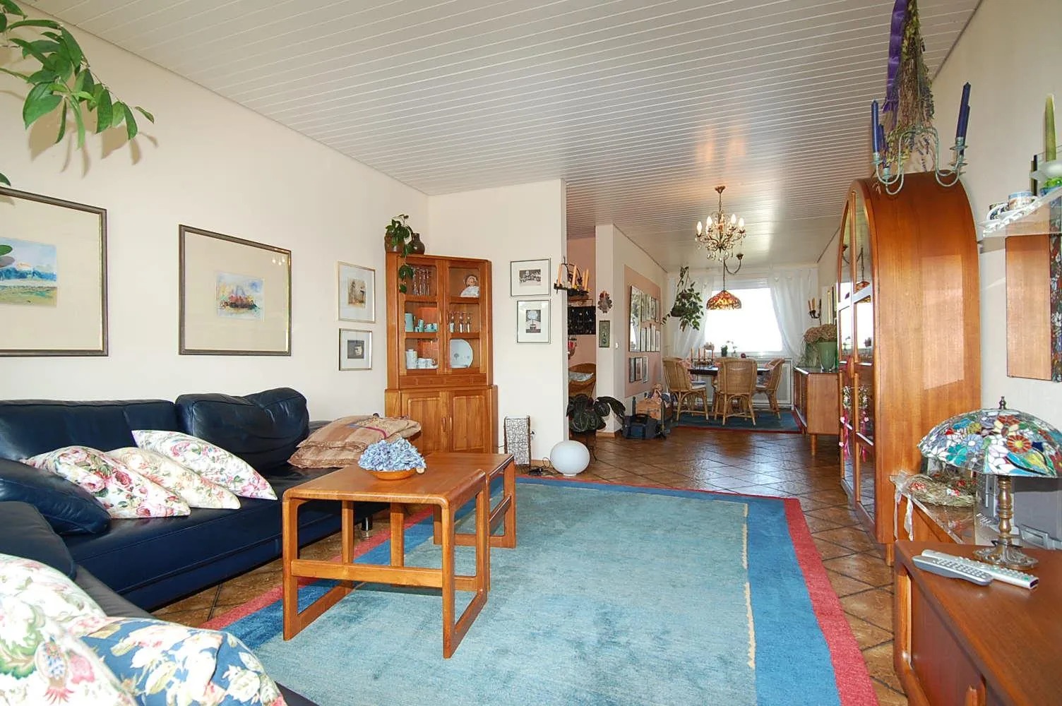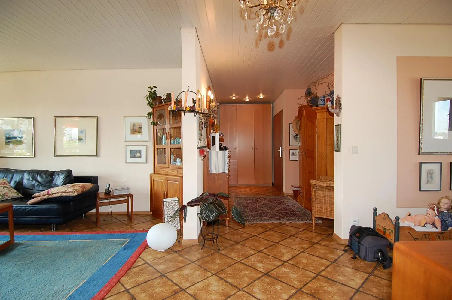 Das Schlaf- und das Kinderzimmer sind mit Parkett ausgestattet. Die anderen Räume sind gefliest und mit weißen Holzdecken ausgestattet.