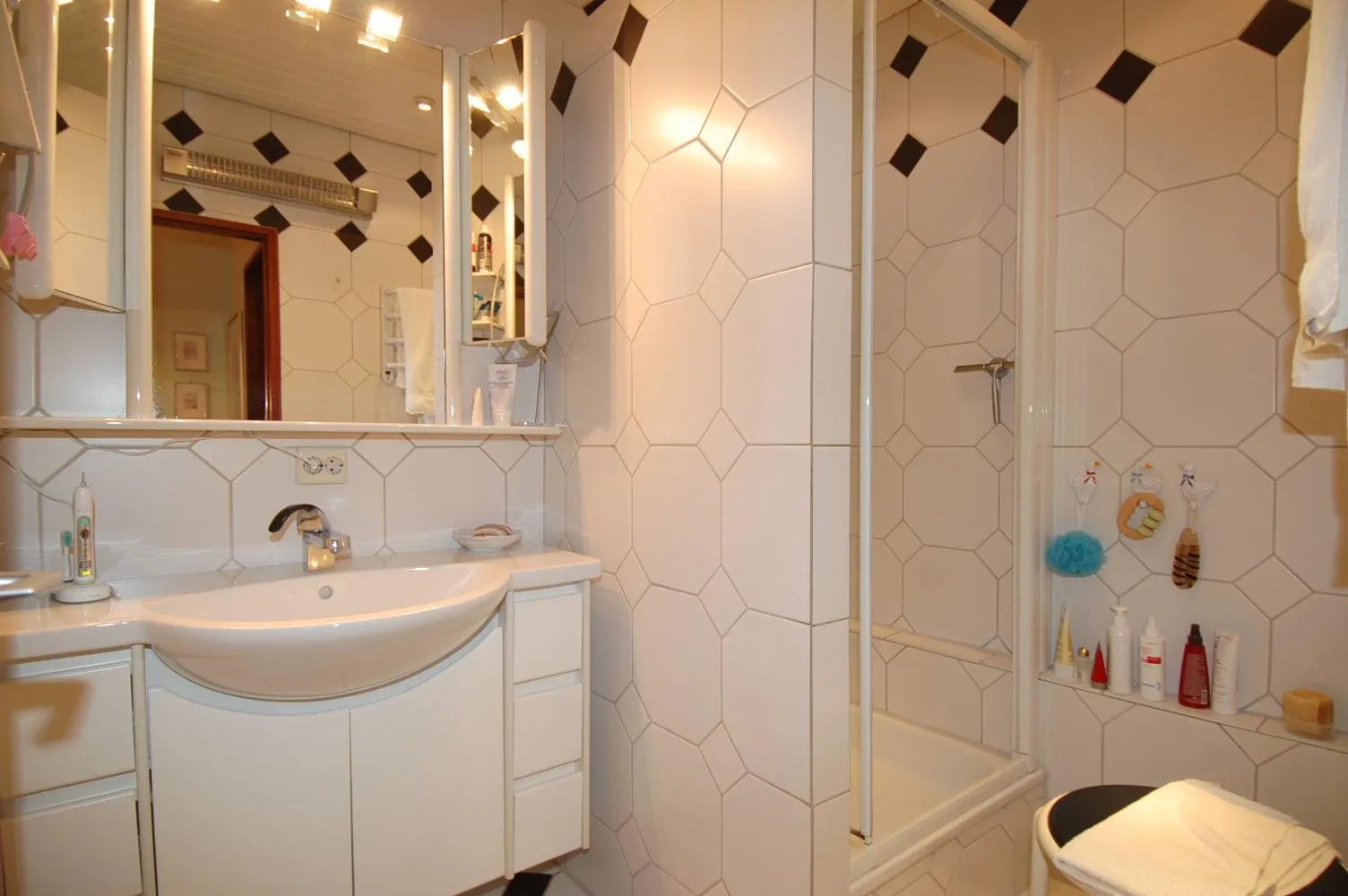 Das Badezimmer ist raumhoch gefliest und mit einer hochwertigen Dusche ausgestattet.