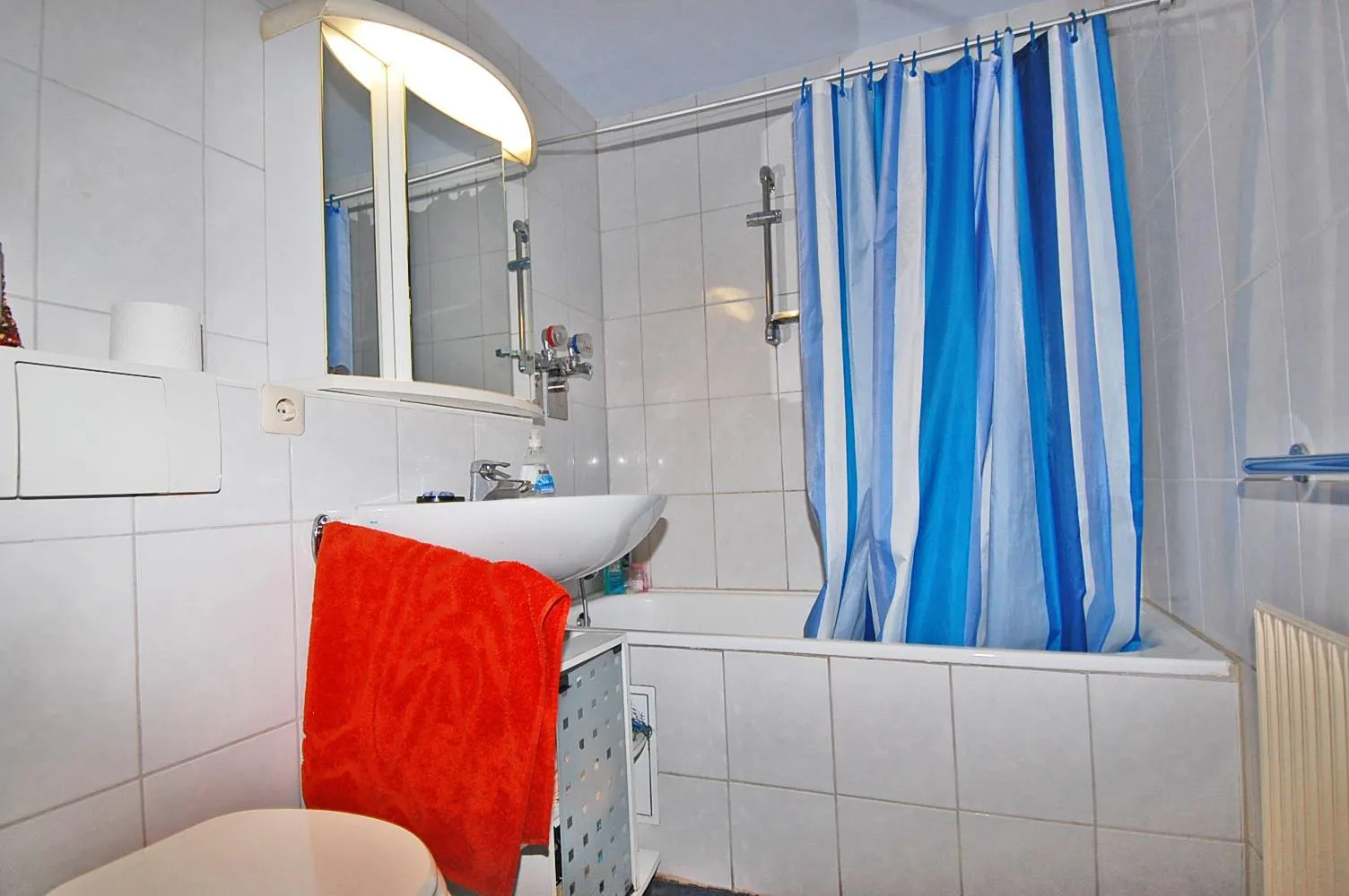 Das Badezimmer ist raumhoch gefliest und ist ausgestattet mit einer Badewanne sowie einem WC.