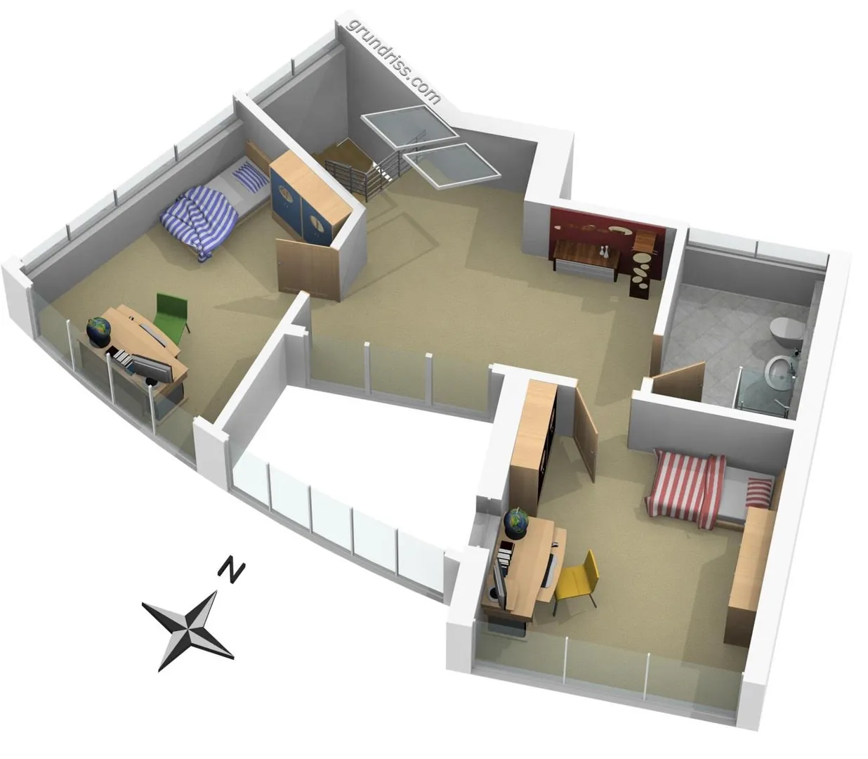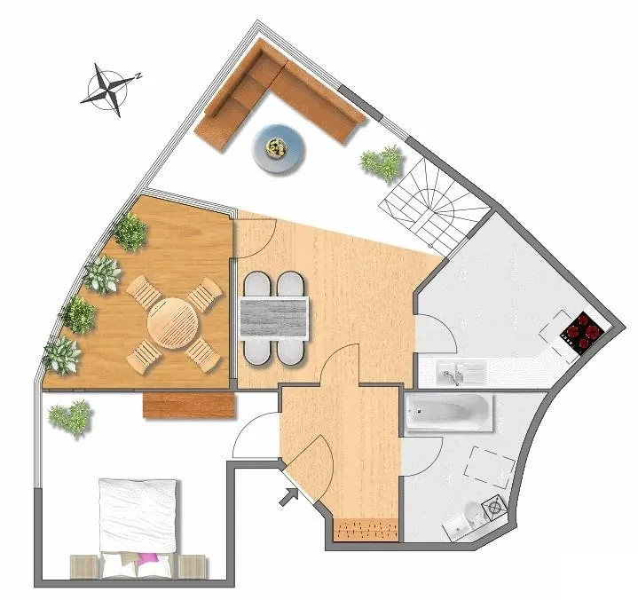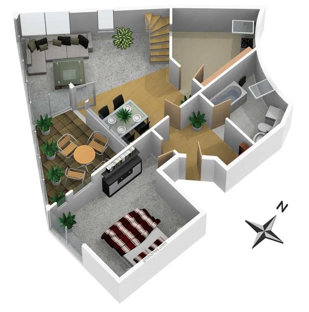 Der Grundriss ist sehr individuell auf zwei Ebenen verteilt: