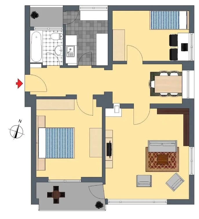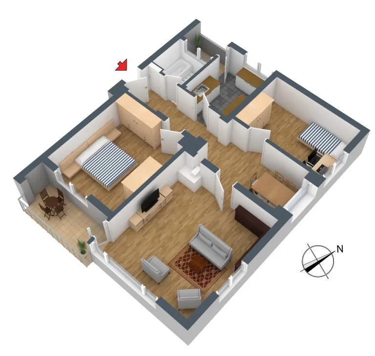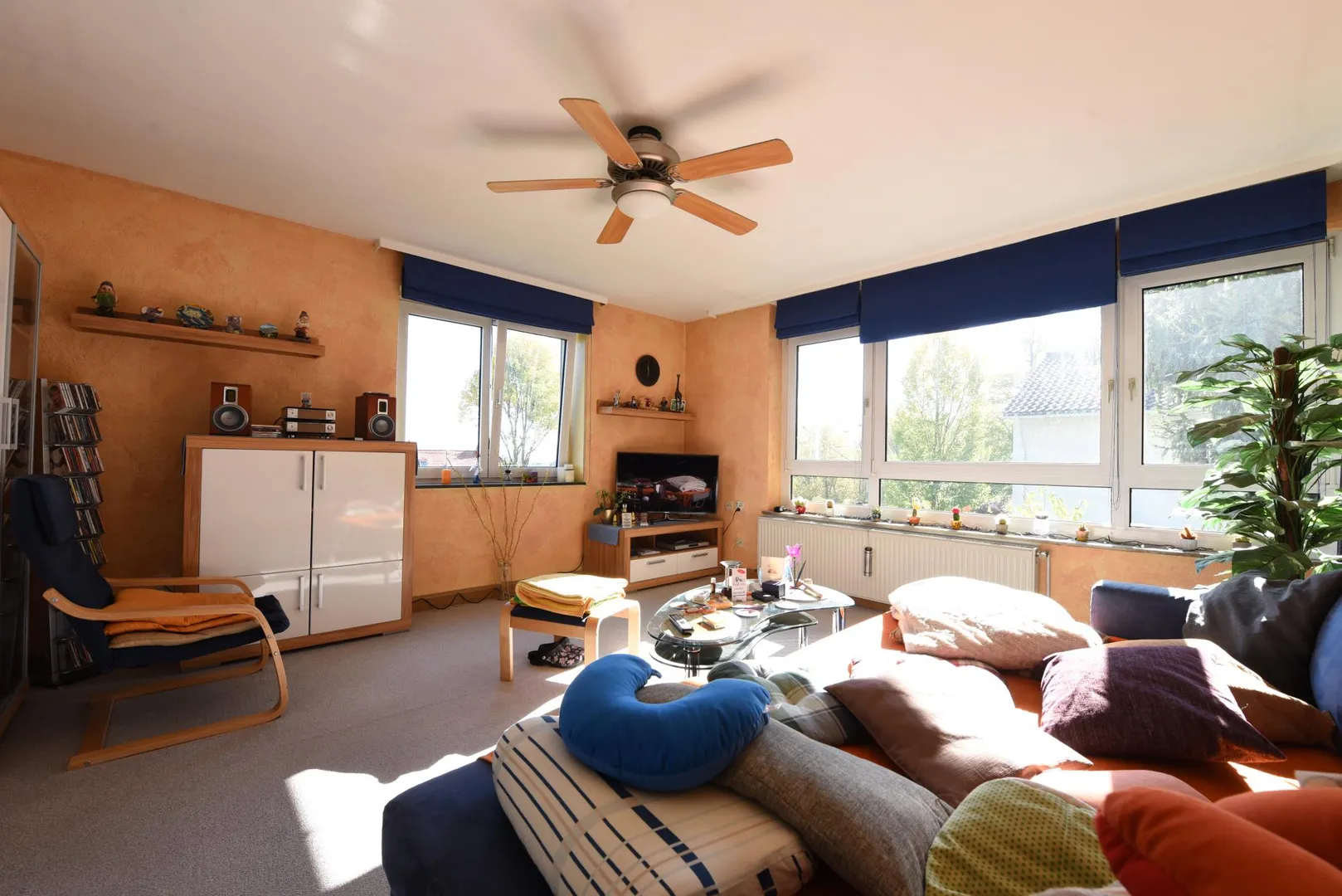 Der Grundriss ist gut. In der Verlängerung vom Flur befindet sich die Essecke. Vom Flur sind alle Räume begehbar. Das Badezimmer verfügt über ein Fenster. Der ca. 5 m² große und überdachte Süd-Balkon ist über das Wohnzimmer begehbar.