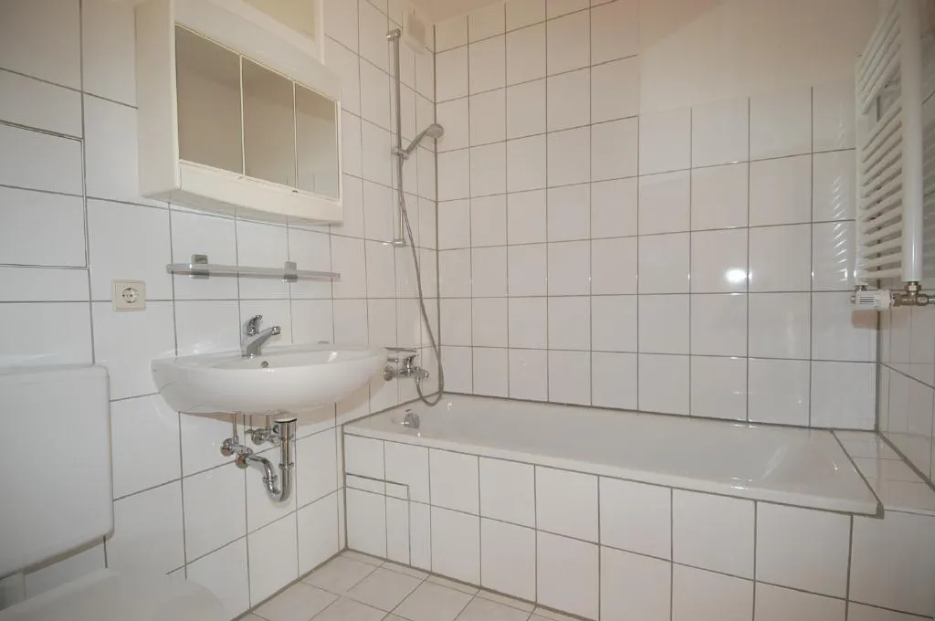 Das Badezimmer ist raumhoch gefliest und ist mit einer Badewanne mit Duschmöglichkeit, einem WC, einem Handtuchheizkörper und mit einen Waschmaschinenanschluß ausgestattet.