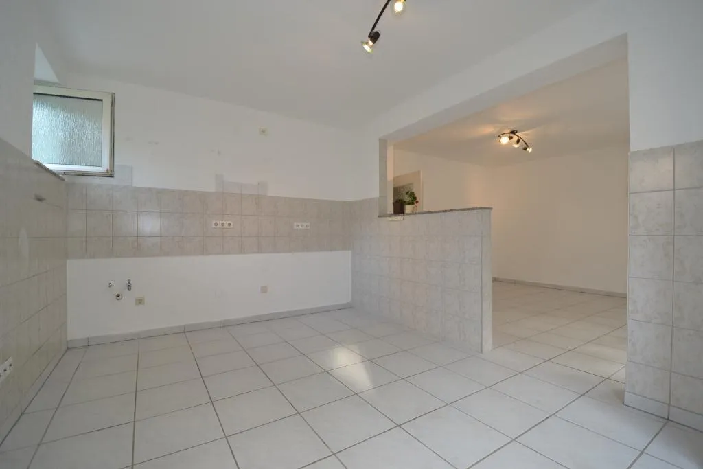 Der Flur, der offene Küchen- und Wohnbereich sowie zwei Bäder sind gefliest.
