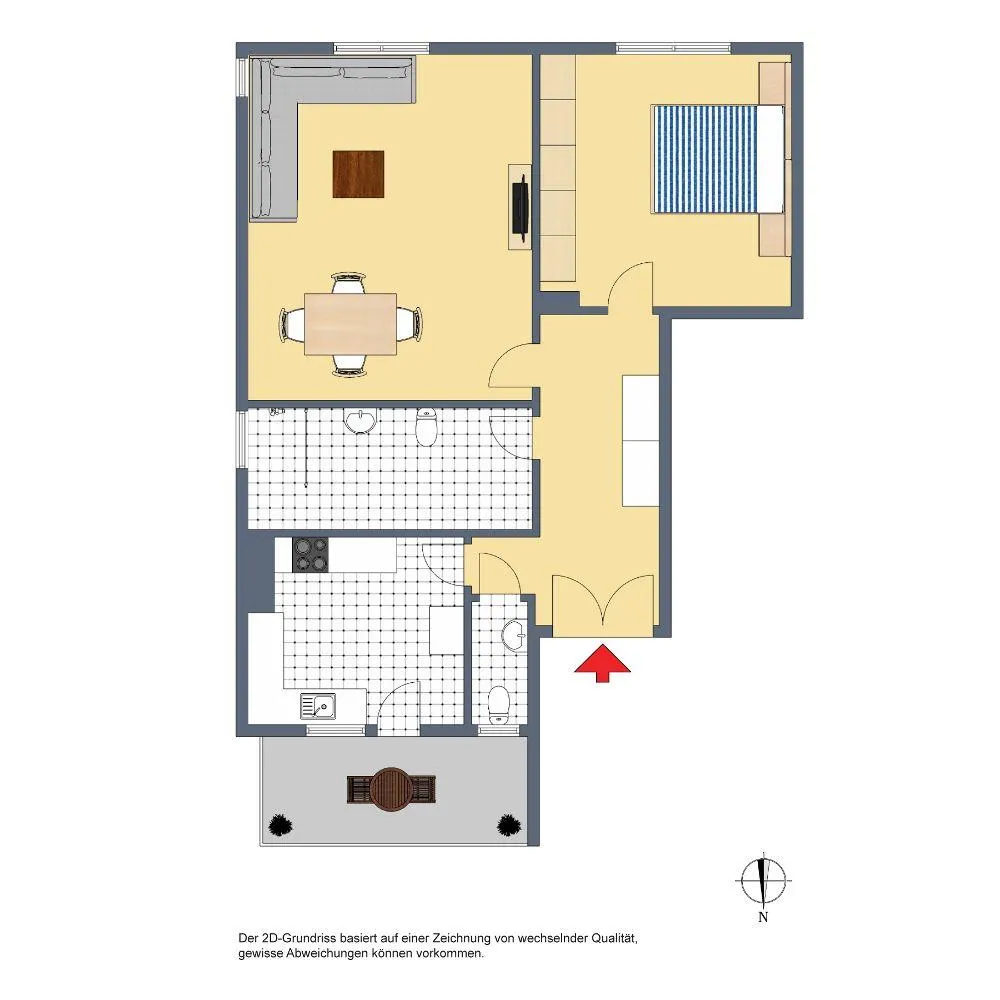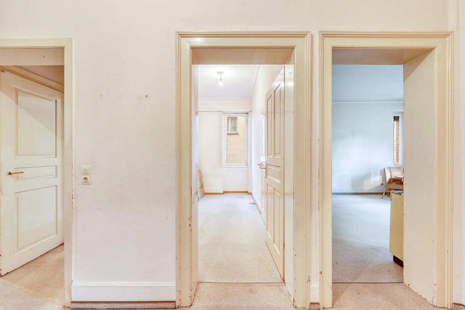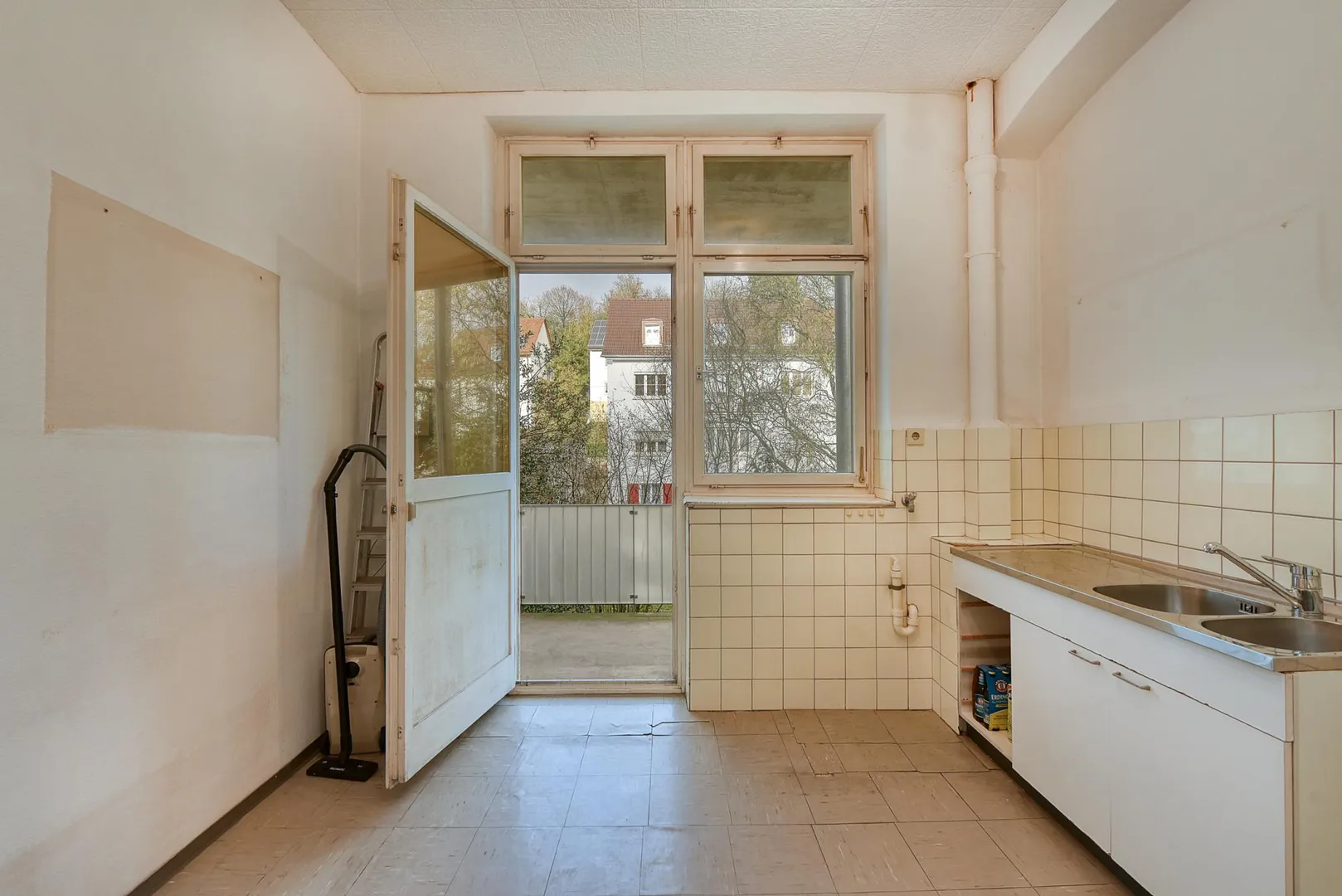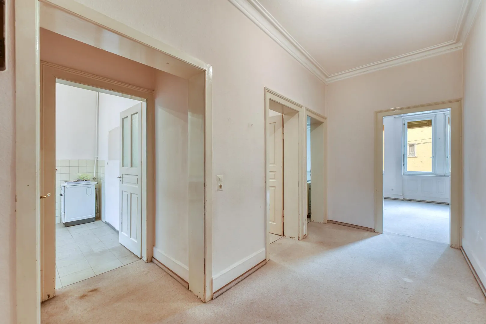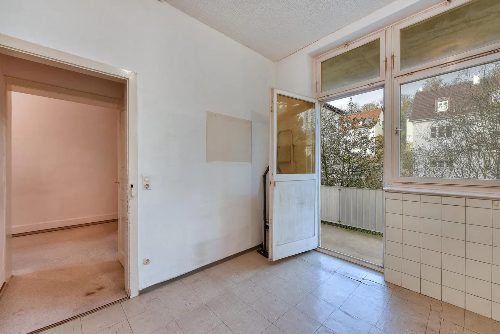 Der Grundriss ist gut: alle Räume sind direkt vom Flur begehbar. Zwischen den Zimmern gibt es zusätzlich Verbindungstüren. Der ca. 7 m² große und überdachte Nord-Balkon ist über die Küche begehbar. Das separate WC sowie das zu errichtende Badezimmer verfügen über Fenster.