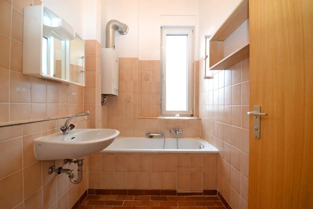 Das ältere Tageslichtbad ist halbhoch gefliest und verfügt über einen Fliesenboden, ein Fenster, eine Wanne und ein Waschbecken.