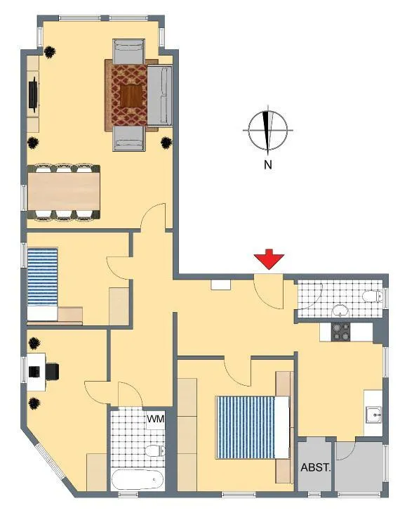Der Grundriss der Wohnung ist gut. Alle Zimmer sind vom Flur aus begehbar. Das Bad und das separate WC sind mit einem Fenster ausgestattet. Das Wohnzimmer mit Erker ist nach Süden ausgerichtet.