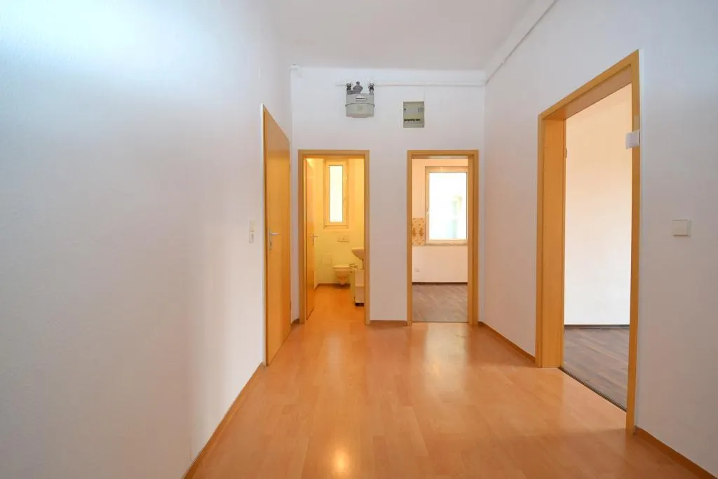 Der Grundriss der Wohnung ist gut. Alle Zimmer sind vom Flur aus begehbar. Das Bad und das separate WC sind mit einem Fenster ausgestattet. Das Wohnzimmer mit Erker ist nach Süden ausgerichtet.