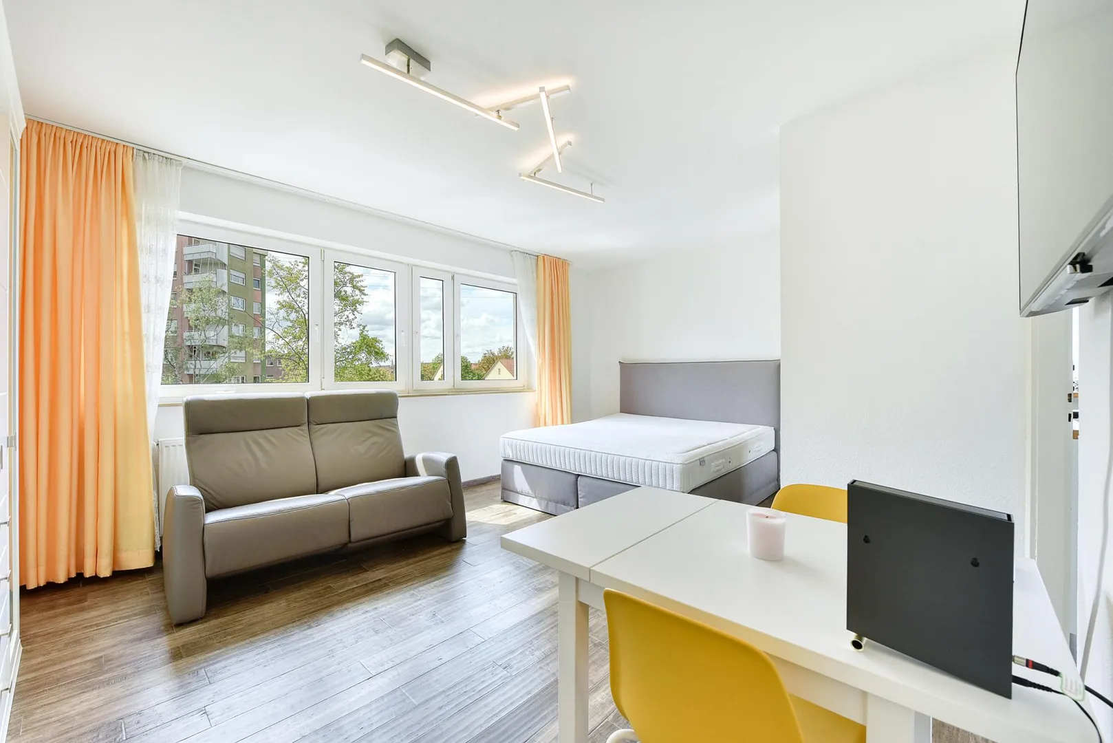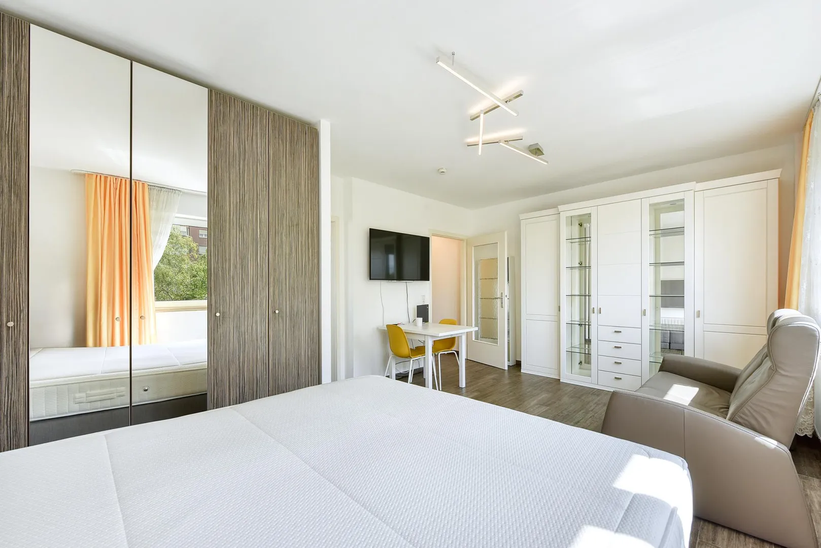 Diese hochwertig modernisierte und möblierte 1-Zimmer-Wohnung befindet sich im 3. Obergeschoss des denkmalgeschützten Hochhauses "ROMEO".